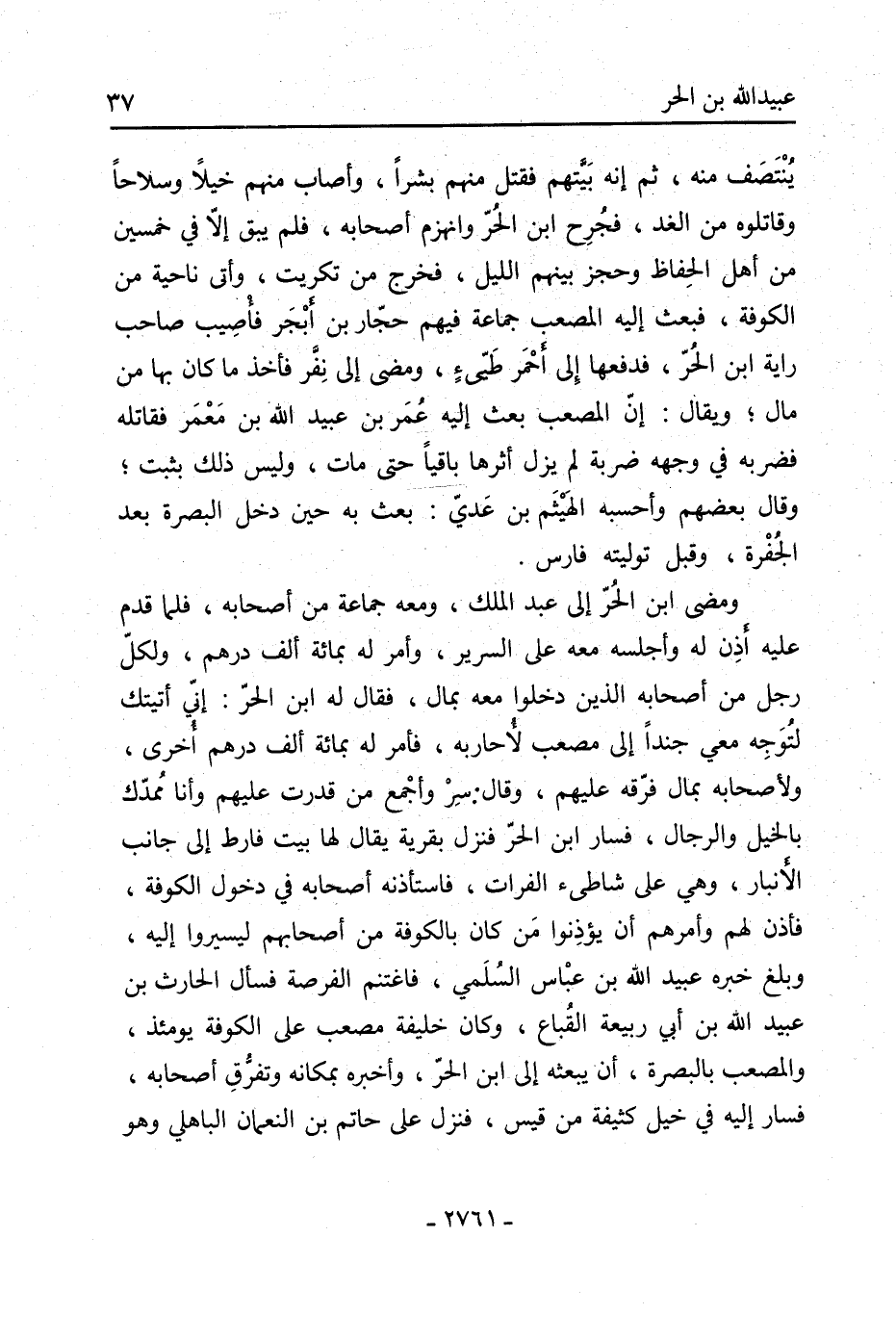 ينتصف منه، ثُمَّ إنه بيتهم فقتل منهم بشرا، وأصاب منهم خيلا وسلاحا وقاتلوه من الغد، فجرح ابْن الحر وانهزم أصحابه، فلم يبق إلا فِي خمسين من أَهْل الحفاظ وحجز بينهم الليل، فخرج من تكريت، وأتى ناحية من الْكُوفَة، فبعث إِلَيْهِ المصعب جماعة فيهم حجار بْن أبجر فأصيب صاحب راية ابْن الحر، فدفعها إِلَى أحمر طيئ، ومضى إِلَى نفر فأخذ مَا كَانَ بِهَا من مال، ويقال: إن المصعب بعث إِلَيْهِ عمر بْن عبيد اللَّه بْن معمر فقاتله فضربه فِي وجهه ضربة لم يزل أثرها باقيا حتى مات، وليس ذلك بثبت، وَقَالَ بعضهم وأحسبه الهيثم بْن عدي: بعث بِهِ حين دخل البصرة بعد الجفرة، وقبل توليته فارس.