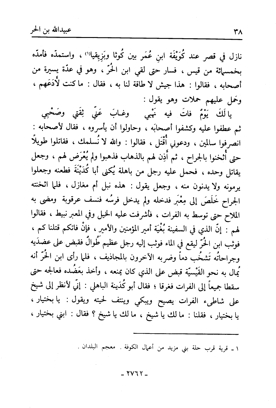 نازل فِي قصر عند كويفة ابْن عمر بين كوثا وبزيقيا [1] ، واستمدّه فأمدّه بخمسمائة من قيس، فسار حَتَّى لقي ابْن الحر، وهو فِي عدة يسيرة من أصحابه، فَقَالُوا: هذا جيش لا طاقة لنا بِهِ، فَقَالَ: مَا كنت لأدعهم، وحمل عليهم حملات وهو يقول: