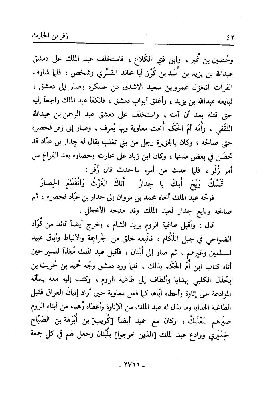 وحصين بْن نمير، وابن ذي الكلاع، فاستخلف عَبْد الْمَلِكِ عَلَى دمشق عَبْد اللَّهِ بْن يَزِيدَ بْن أسد بْن كرز أبا خالد القسري وشخص، فلما شارف الفرات انخزل عَمْرو بْن سعيد الأشدق من عسكره وصار إِلَى دمشق، فبايعه عَبْد اللَّهِ بْن يَزِيدَ، وأغلق أبواب دمشق، فانكفأ عَبْد الْمَلِكِ راجعا إِلَيْهِ حَتَّى قتله بعد أن آمنه، واستخلف عَلَى دمشق عَبْد الرَّحْمَنِ بْن عَبْد اللَّهِ الثقفي، وأمه أم الحكم أخت مُعَاوِيَة وبها يعرف، وصار إِلَى زفر فحصره حَتَّى صالحه، وَكَانَ بالجزيرة رجل من بني تغلب يقال لَهُ جدار بْن عباد قد تحصن فِي بعض مدنها، وَكَانَ ابْن زياد عَلَى محاربته وحصاره بعد الفراغ من أمر زفر، فلما حدث من أمره مَا حدث قَالَ زفر: