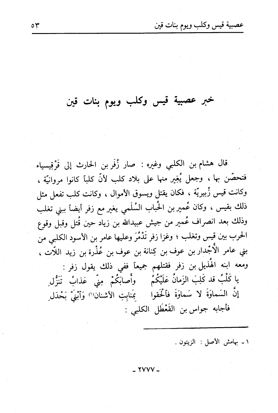 قَالَ هِشَام بْن الْكَلْبِيّ وغيره: صار زفر بْن الحارث إِلَى قرقيسياء فتحصن بِهَا، وجعل يغير منها على بلاد كلب لأن كلبا كانوا مروانية، وكانت قيس زبيرية، فكان يقتل ويسوق الأموال، وكانت كلب تفعل مثل ذَلِكَ بقيس، وَكَانَ عمير بْن الحباب السلمي يغير مَعَ زفر أيضا ببني تغلب وذلك بعد انصراف عمير من جيش عبيد اللَّه بْن زياد حين قتل وقبل وقوع الحرب بين قيس وتغلب، وغزا زفر تدمر وعليها عامر بْن الأسود الْكَلْبِيّ من بني عامر الأجدار بْن عوف بْن كنانة بْن عوف بْن عذرة بْن زيد اللات، ومعه ابنه الهذيل بْن زفر فقتلهم جميعا ففي ذَلِكَ يقول زفر: