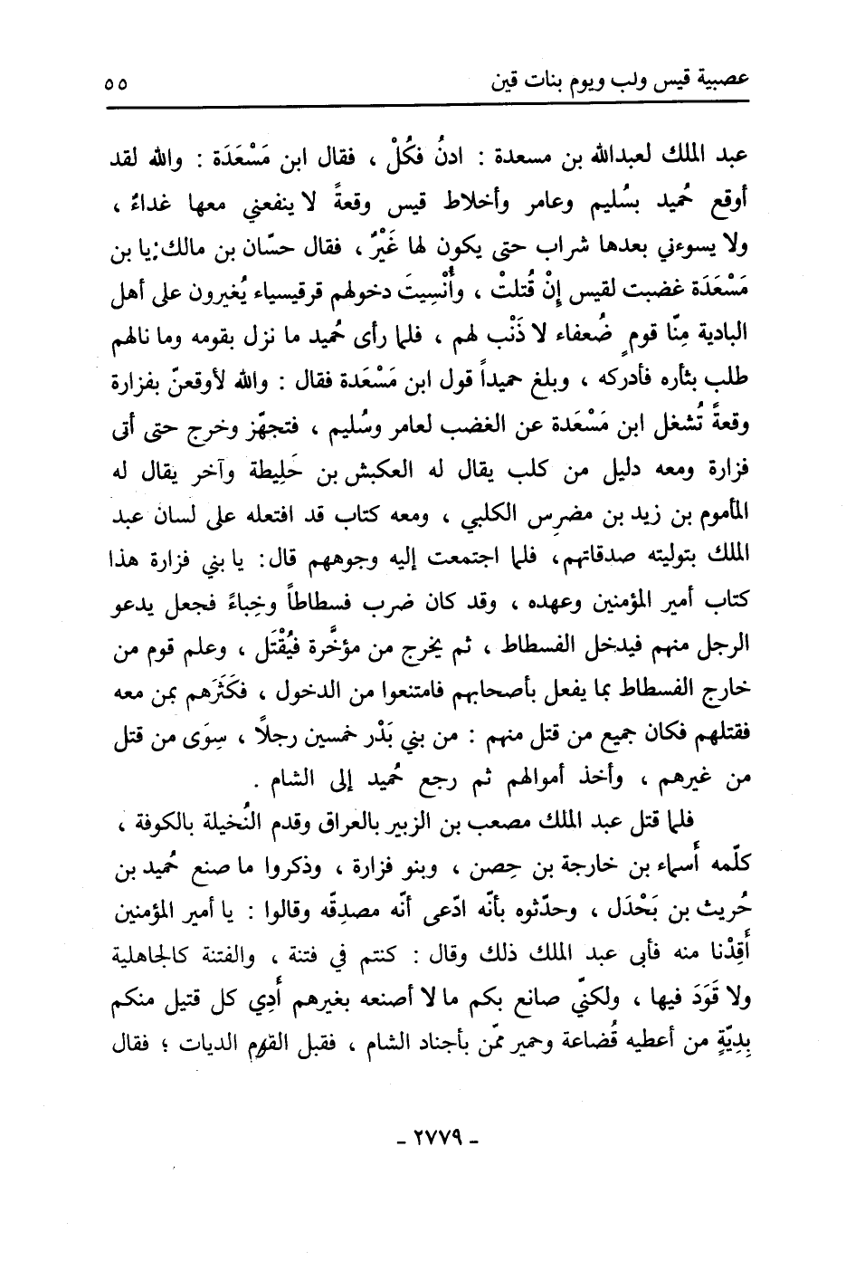 عَبْد الْمَلِكِ لعَبْد اللَّهِ بْن مسعدة: ادن فكل، فَقَالَ ابْن مسعدة: والله لقد أوقع حميد بسليم وعامر وأخلاط قيس وقعة لا ينفعني مَعَهَا غداء، ولا يسوءني بعدها شراب حَتَّى يكون لها غير، فَقَالَ حسان بْن مالك: يا بن مسعدة غضبت لقيس إن قتلت، وأنسيت دخولهم قرقيسياء يغيرون عَلَى أَهْل البادية منا قوم ضعفاء لا ذنب لهم، فلما رأى حميد مَا نزل بقومه وما نالهم طلب بثأره فأدركه، وبلغ حميدا قول ابْن مسعدة فَقَالَ: والله لأوقعن بفزارة وقعة تشغل ابْن مسعدة عَن الغضب لعامر وسليم، فتجهز وخرج حَتَّى أتى فزارة ومعه دليل من كلب يقال لَهُ العكبش بْن حليطة وآخر يقال لَهُ المأموم بْن زيد بْن مضرس الْكَلْبِيّ، ومعه كتاب قد افتعله عَلَى لسان عَبْد الْمَلِكِ بتوليته صدقاتهم، فلما اجتمعت إِلَيْهِ وجوههم قال: يا بني فزارة هذا كتاب أَمِير الْمُؤْمِنِينَ وعهده، وقد كَانَ ضرب فسطاطا وخباء فجعل يدعو الرجل منهم فيدخل الفسطاط، ثُمَّ يخرج من مؤخرة فيقتل، وعلم قوم من خارج الفسطاط بما يفعل بأصحابهم فامتنعوا من الدخول، فكثرهم بمن مَعَهُ فقتلهم فكان جميع من قتل منهم: من بني بدر خمسين رجلا، سوى من قتل من غيرهم، وأخذ أموالهم ثُمَّ رجع حميد إِلَى الشام.