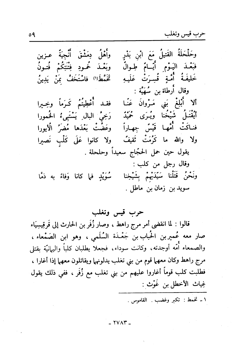 قالوا: لما انقضى أمر مرج راهط، وصار زفر بْن الحارث إِلَى قرقيسياء صار مَعَهُ عمير بْن الحباب بْن جعدة السلمي، وهو ابن الصمعاء، والصمعاء أمّة أوجدته، وكانت سوداء، فجعلا يطلبان كلبا واليمانية بقتلى مرج راهط وَكَانَ معهما قوم من بني تغلب يدلونهما ويقاتلون معهما إذا أغارا، فطلبت كلب قوما أغاروا عليهم من بني تغلب مَعَ زفر، ففي ذَلِكَ يقول غياث الأخطل بن غوث: