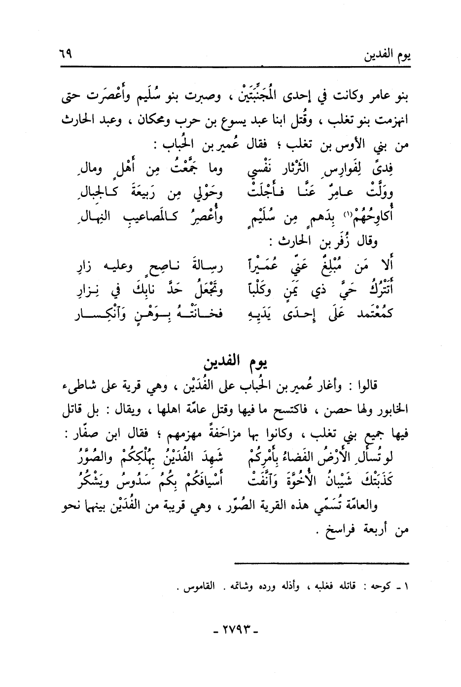 قالوا: وأغار عمير بْن الحباب عَلَى الفدين، وهي قرية عَلَى شاطئ الخابور ولها حصن، فاكتسح مَا فيها وقتل عامة أهلها، ويقال: بل قاتل فيها جميع بني تغلب، وكانوا بِهَا مزاحفة مهزمهم، فَقَالَ ابْن صفار: