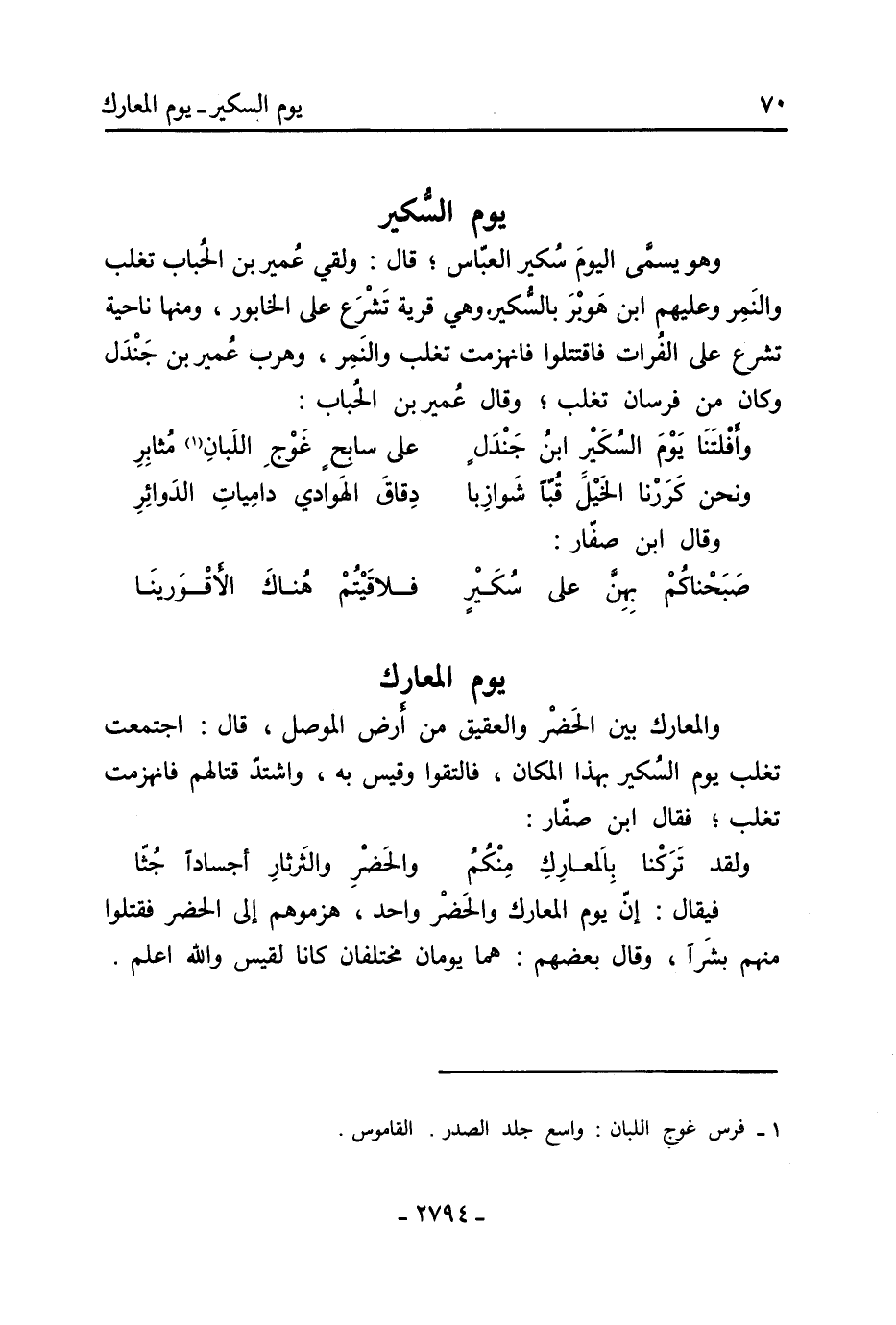 والمعارك بين الحضر والعقيق من أرض الموصل، قَالَ: اجتمعت تغلب يوم السكير بهذا المكان، فالتقوا وقيس بِهِ، واشتد قتالهم فانهزمت تغلب، فَقَالَ ابْن صفار: