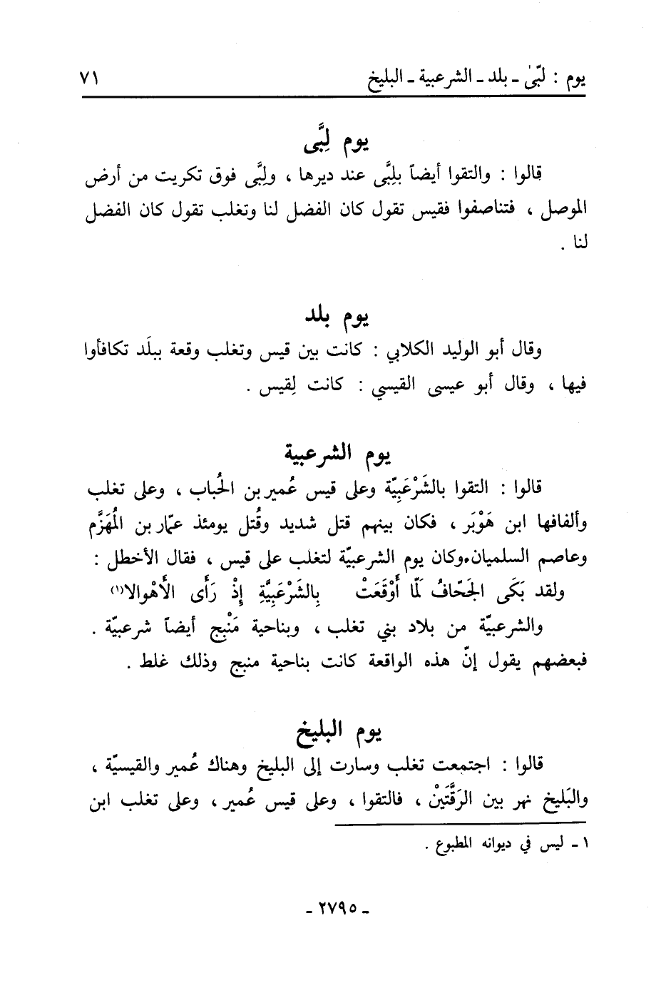 وَقَالَ أَبُو الوليد الكلابي: كانت بين قيس وتغلب وقعة ببلد تكافأوا فيها، وَقَالَ أَبُو عيسى القيسي: كانت لقيس.