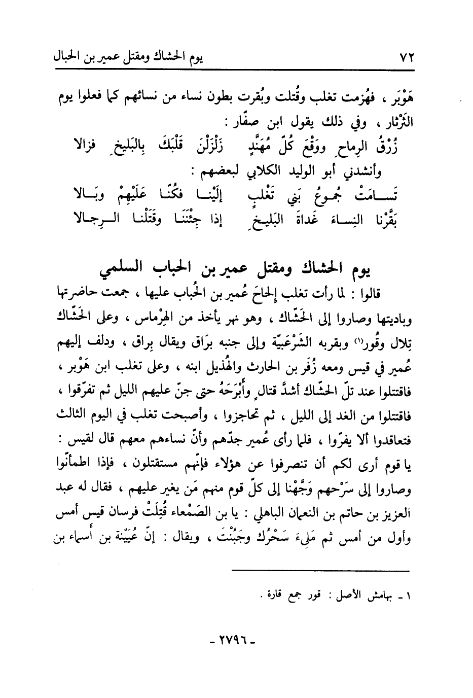 قالوا: لما رأت تغلب إلحاح عمير بْن الحباب عَلَيْهَا، جمعت حاضرتها وباديتها وصاروا إِلَى الحشاك، وهو نهر يأخذ من الهرماس، وعلى الحشاك تلال وقور [1] وبقربه الشرعبية وإلى جنبه براق ويقال براق، ودلف إليهم عمير فِي قيس ومعه زفر بْن الحارث والهذيل ابنه، وعلى تغلب ابْن هوبر، فاقتتلوا عند تل الحشاك أشد قتال وأبرحه حَتَّى جن عليهم الليل ثُمَّ تفرقوا، فاقتتلوا من الغد إِلَى الليل، ثُمَّ تحاجزوا، وأصبحت تغلب فِي اليوم الثالث فتعاقدوا ألا يفروا، فلما رأى عمير جدهم وأن نساءهم مَعَهُمْ قَالَ لقيس: