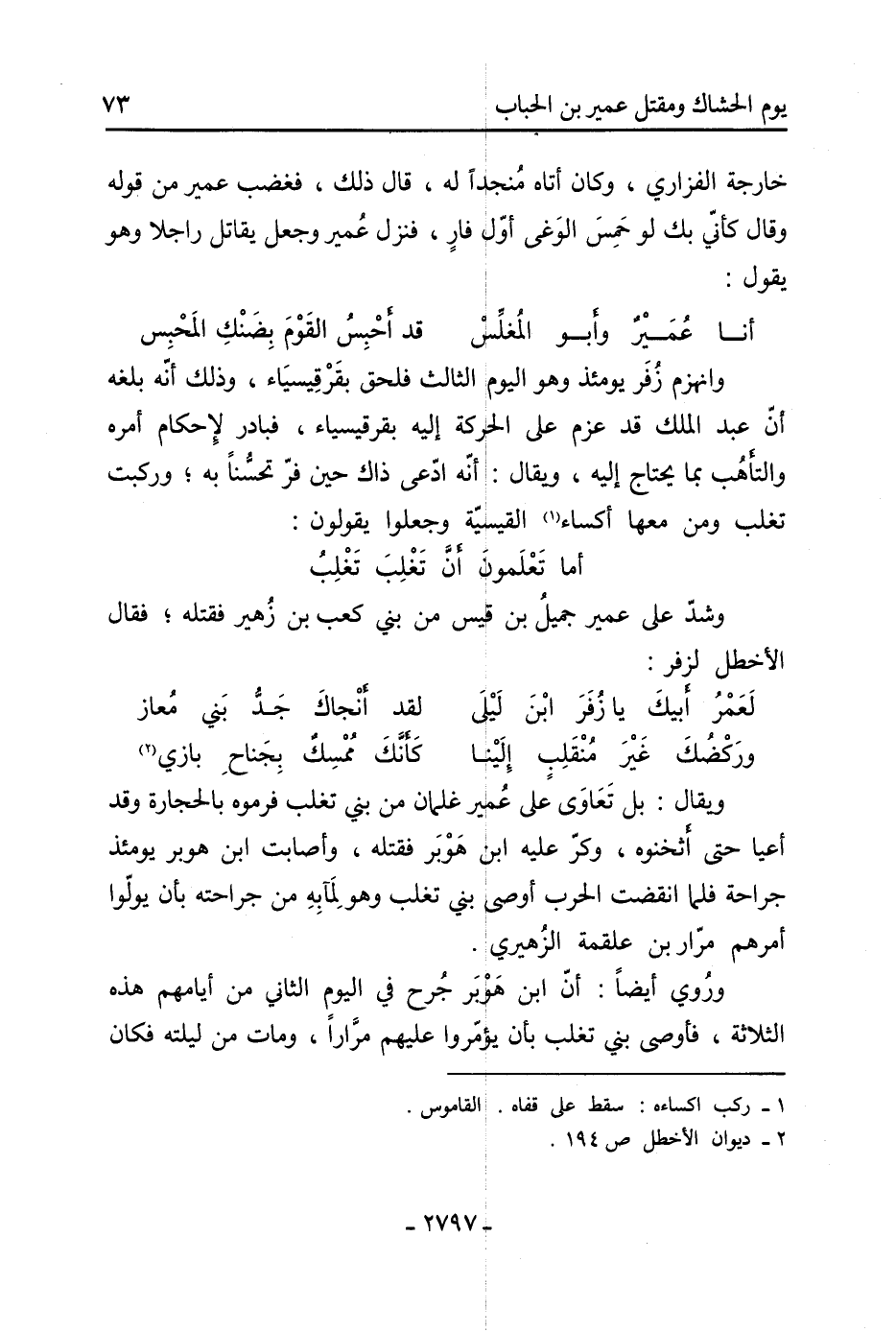 ويقال: بل تعاوى عَلَى عمير غلمان من بني تغلب فرموه بالحجارة وقد أعيا حَتَّى أثخنوه، وكر عَلَيْهِ ابْن هوبر فقتله، وأصابت ابْن هوبر يومئذ جراحة فلما انقضت الحرب أوصى بني تغلب وهو لمآبه من جراحته بأن يولوا أمرهم مرار بْن علقمة الزهيري.