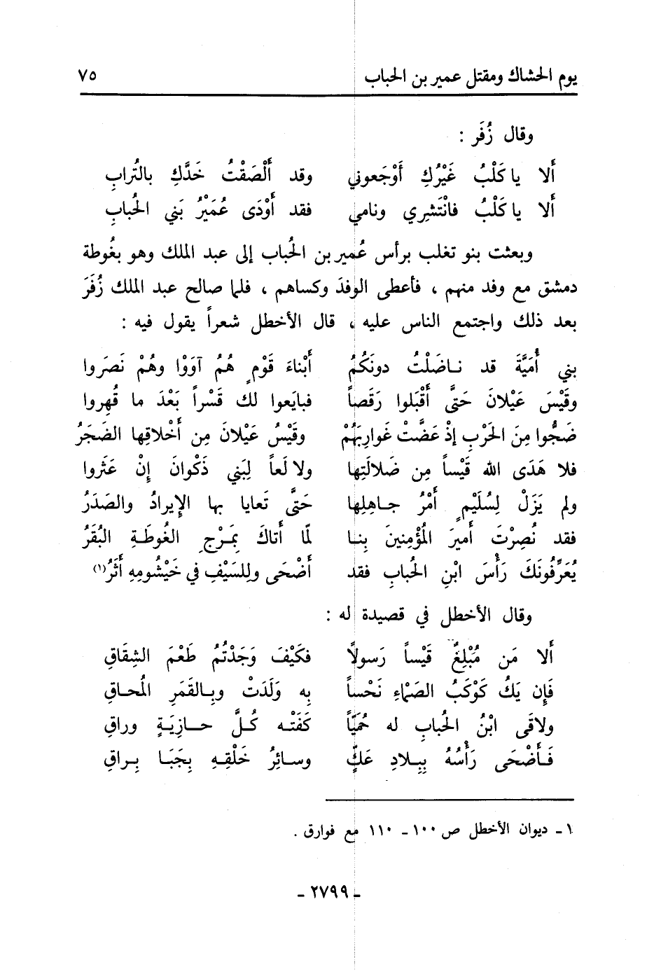 وبعثت بنو تغلب برأس عمير بْن الحباب إِلَى عَبْد الْمَلِكِ وهو بغوطة دمشق مَعَ وفد منهم، فأعطى الوفد وكساهم، فلما صالح عَبْد الْمَلِكِ زفر بعد ذَلِكَ واجتمع النَّاس عَلَيْهِ، قَالَ الأخطل شعرا يقول فيه: