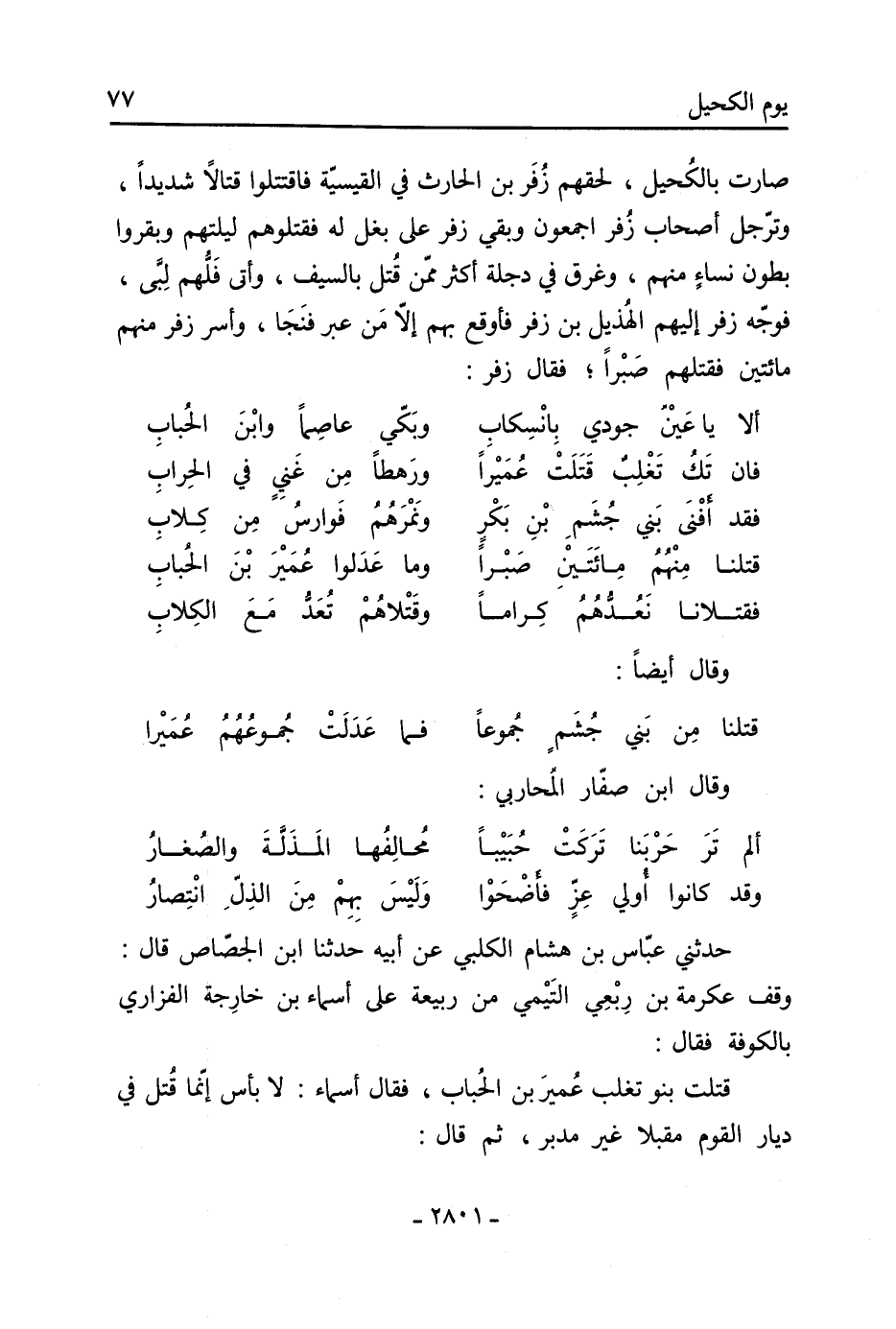 فقد أفنى بني جشم بْن بكر ... ونمرهم فوارس من كلاب