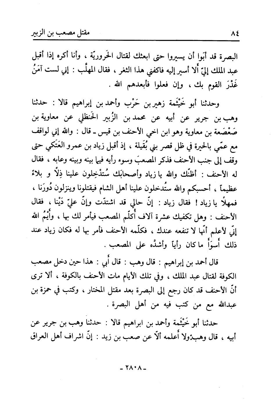 وَحَدَّثَنَا أَبُو خَيْثَمَةَ زُهَيْرُ بْنُ حَرْبٍ وَأَحْمَدُ بْن إِبْرَاهِيمَ قالا: حَدَّثَنَا وهب بْن جرير عَنْ أَبِيهِ عَنْ مُحَمَّدِ بْنِ الزُّبَيْرِ الْحَنْظَلِيِّ عَن مُعَاوِيَة بْن صعصعة بْن مُعَاوِيَةَ وهو ابْن أخي الأحنف بْن قيس- قَالَ: والله إني لواقف مَعَ عمي بالحيرة فِي ظل قصر بني بقيلة، إذ أقبل زياد بْن عَمْرو العتكي حَتَّى وقف إِلَى جنب الأحنف فذكر المصعب وسوء رأيه فيما بينه وبينه وعابه، فَقَالَ لَهُ الأحنف: أظنك والله يَا زياد وأصحابك ستدخلون عَلَيْنَا ذلا وبلاء عظيما، أحسبكم والله ستدخلون عَلَيْنَا أَهْل الشام فيقتلونا وينزلون دورنا، فمهلا يَا زياد! فَقَالَ زياد: إن حالي قد اشتدت وإن علي دينا، فَقَالَ الأحنف: وهل تكفيك عشرة آلاف أكلم المصعب فيأمر لك بِهَا، وأيم اللَّه إني لأعلم أنها لا تنفعه عندك، فكلمه الأحنف فأمر بِهَا لَهُ فكان زياد عند ذَلِكَ أسوأ مَا كَانَ رأيا وأشده عَلَى المصعب.