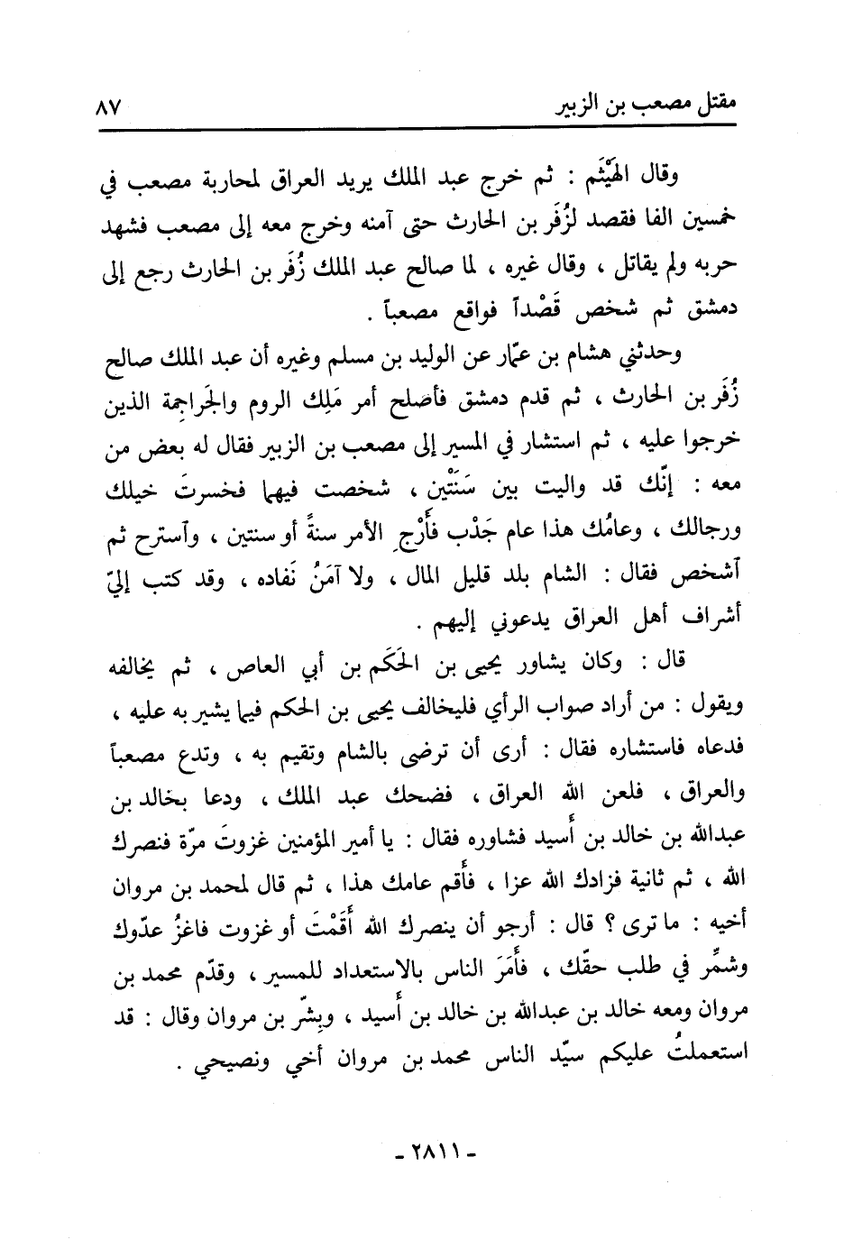 وَحَدَّثَنِي هِشَامُ بْنُ عَمَّارٍ عَن الوليد بْن مُسْلِم وغيره أن عَبْد الْمَلِكِ صالح زفر بْن الحارث، ثُمَّ قدم دمشق فأصلح أمر ملك الروم والجراجمة الذين خرجوا عَلَيْهِ، ثُمَّ استشار فِي المسير إِلَى مصعب بْن الزُّبَيْرِ فَقَالَ لَهُ بعض من مَعَهُ: إنك قد واليت بين سنتين، شخصت فيهما فخسرت خيلك ورجالك، وعامك هذا عام جدب فأرج الأمر سنة أو سنتين، واسترح ثُمَّ اشخص فَقَالَ: الشام بلد قليل المال، ولا آمن نفاده، وقد كتب إلي أشراف أَهْل العراق يدعوني إليهم.
