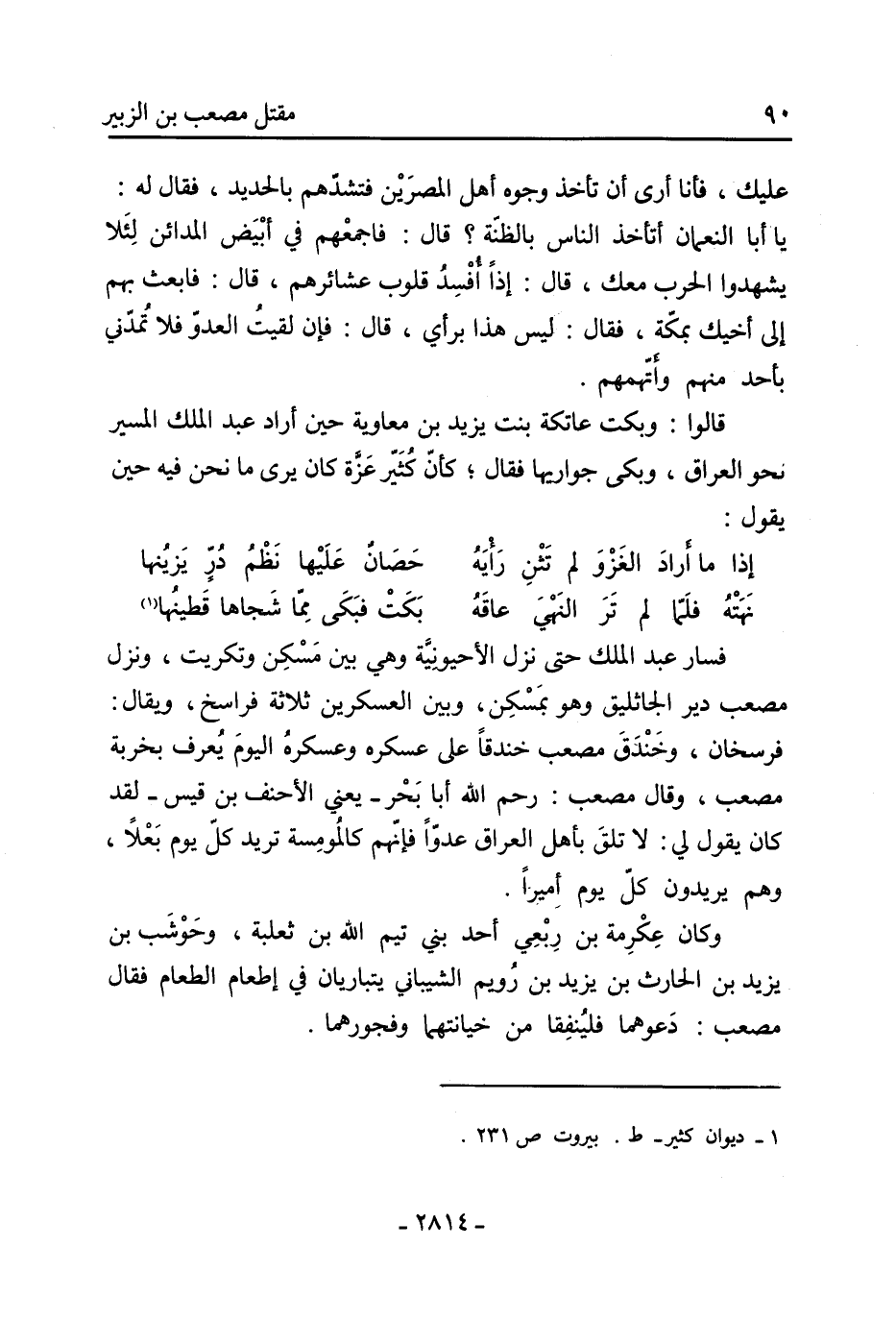 قالوا: وبكت عاتكة بنت يَزِيد بْن مُعَاوِيَةَ حين أراد عَبْد الْمَلِكِ المسير نحو العراق، وبكى جواريها فَقَالَ، كأن كثير عزة كَانَ يرى مَا نحن فيه حين يقول:
