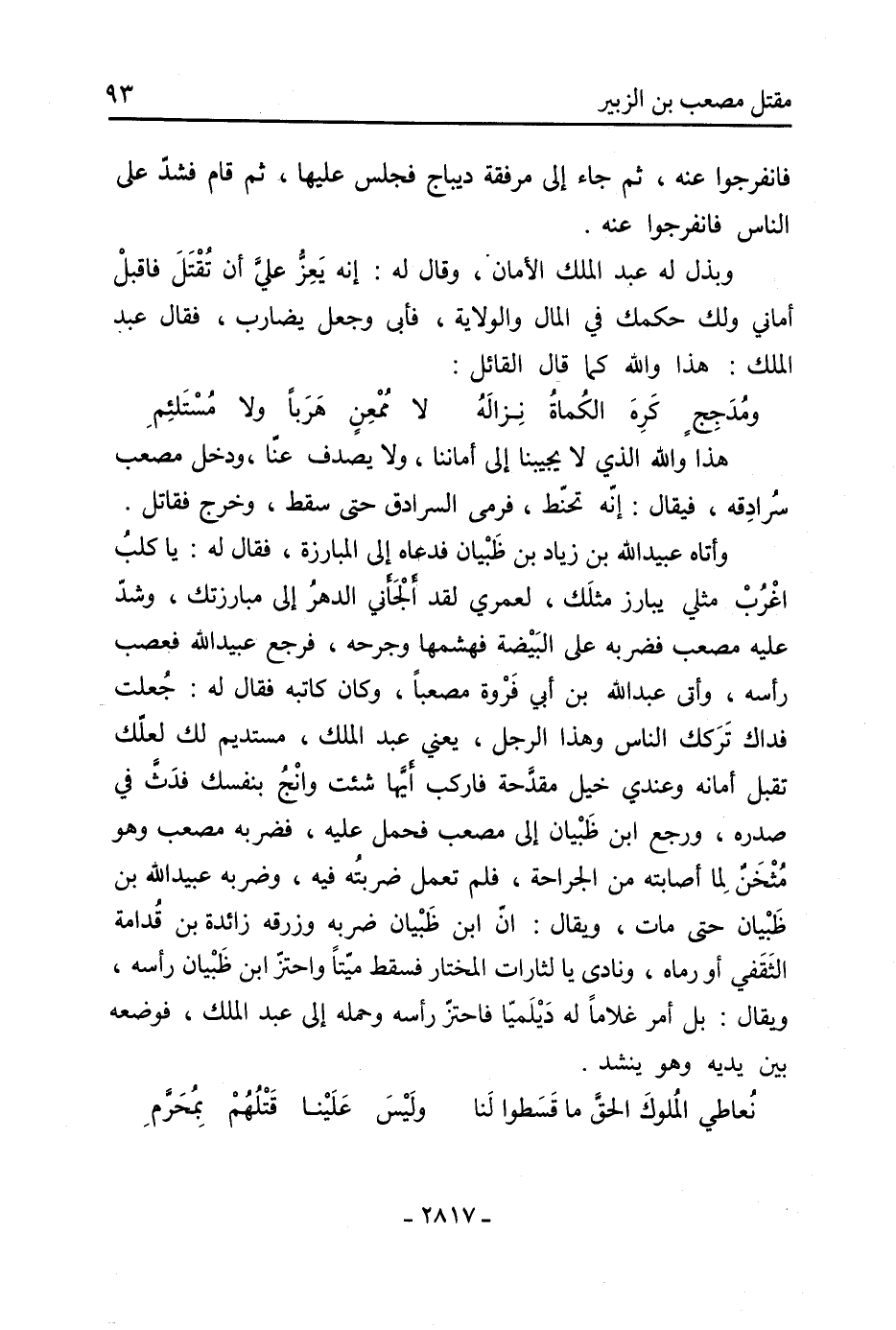 وأتاه عبيد اللَّه بْن زياد بْن ظبيان فدعاه إِلَى المبارزة، فَقَالَ لَهُ: يَا كلب اغرب مثلي يبارز مثلك، لعمري لقد ألجأني الدهر إِلَى مبارزتك، وشد عَلَيْهِ مصعب فضربه عَلَى البيضة فهشمها وجرحه، فرجع عبيد اللَّه فعصب رأسه، وأتى عَبْد اللَّهِ بْن أَبِي فروة مصعبا، وَكَانَ كاتبه فَقَالَ لَهُ: جعلت فداك تركك النَّاس وهذا الرجل، يعني عَبْد الْمَلِكِ، مستديم لك لعلك تقبل أمانه وعندي خيل مقدحة فاركب أيها شئت وانج بنفسك فدث فِي صدره، ورجع ابْن ظبيان إِلَى مصعب فحمل عَلَيْهِ، فضربه مصعب وهو مثخن لما أصابته من الجراحة، فلم تعمل ضربته فيه، وضربه عبيد اللَّه بْن ظبيان حَتَّى مات، ويقال: إن ابْن ظبيان ضربه وزرقه زائدة بْن قدامة الثقفي أو رماه، ونادى يَا لثارات المختار فسقط ميتا واحتز ابْن ظبيان رأسه، ويقال: بل أمر غلاما لَهُ ديلميا فاحتز رأسه وحمله إِلَى عَبْد الْمَلِكِ، فوضعه بين يديه وهو ينشد.
