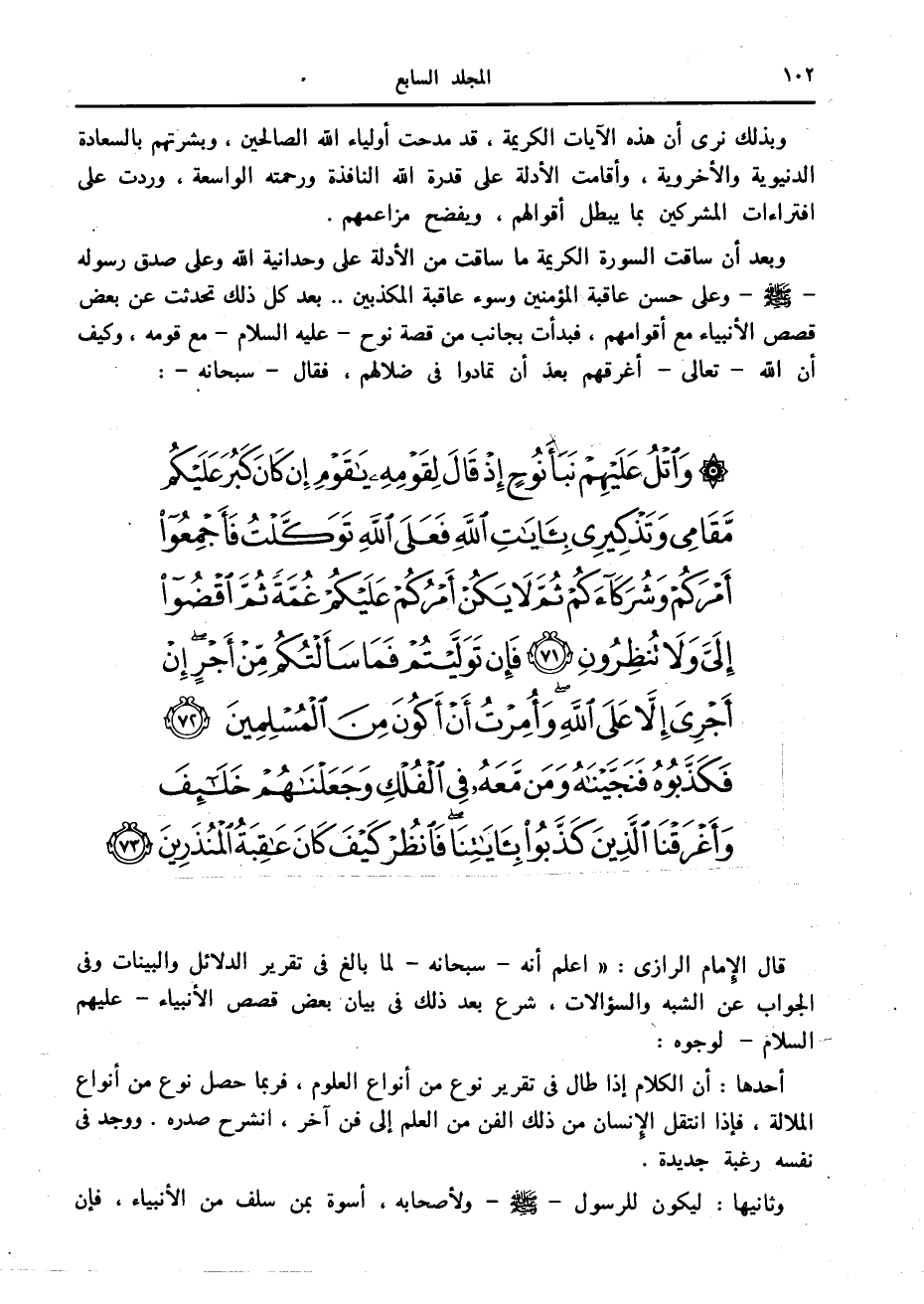 وَاتْلُ عَلَيْهِمْ نَبَأَ نُوحٍ إِذْ قالَ لِقَوْمِهِ يا قَوْمِ إِنْ كانَ كَبُرَ عَلَيْكُمْ مَقامِي وَتَذْكِيرِي بِآياتِ اللَّهِ فَعَلَى اللَّهِ تَوَكَّلْتُ فَأَجْمِعُوا أَمْرَكُمْ وَشُرَكاءَكُمْ ثُمَّ لا يَكُنْ أَمْرُكُمْ عَلَيْكُمْ غُمَّةً ثُمَّ اقْضُوا إِلَيَّ وَلا تُنْظِرُونِ (71) فَإِنْ تَوَلَّيْتُمْ فَما سَأَلْتُكُمْ مِنْ أَجْرٍ إِنْ أَجْرِيَ إِلاَّ عَلَى اللَّهِ وَأُمِرْتُ أَنْ أَكُونَ مِنَ الْمُسْلِمِينَ (72) فَكَذَّبُوهُ فَنَجَّيْناهُ وَمَنْ مَعَهُ فِي الْفُلْكِ وَجَعَلْناهُمْ خَلائِفَ وَأَغْرَقْنَا الَّذِينَ كَذَّبُوا بِآياتِنا فَانْظُرْ كَيْفَ كانَ عاقِبَةُ الْمُنْذَرِينَ (73)