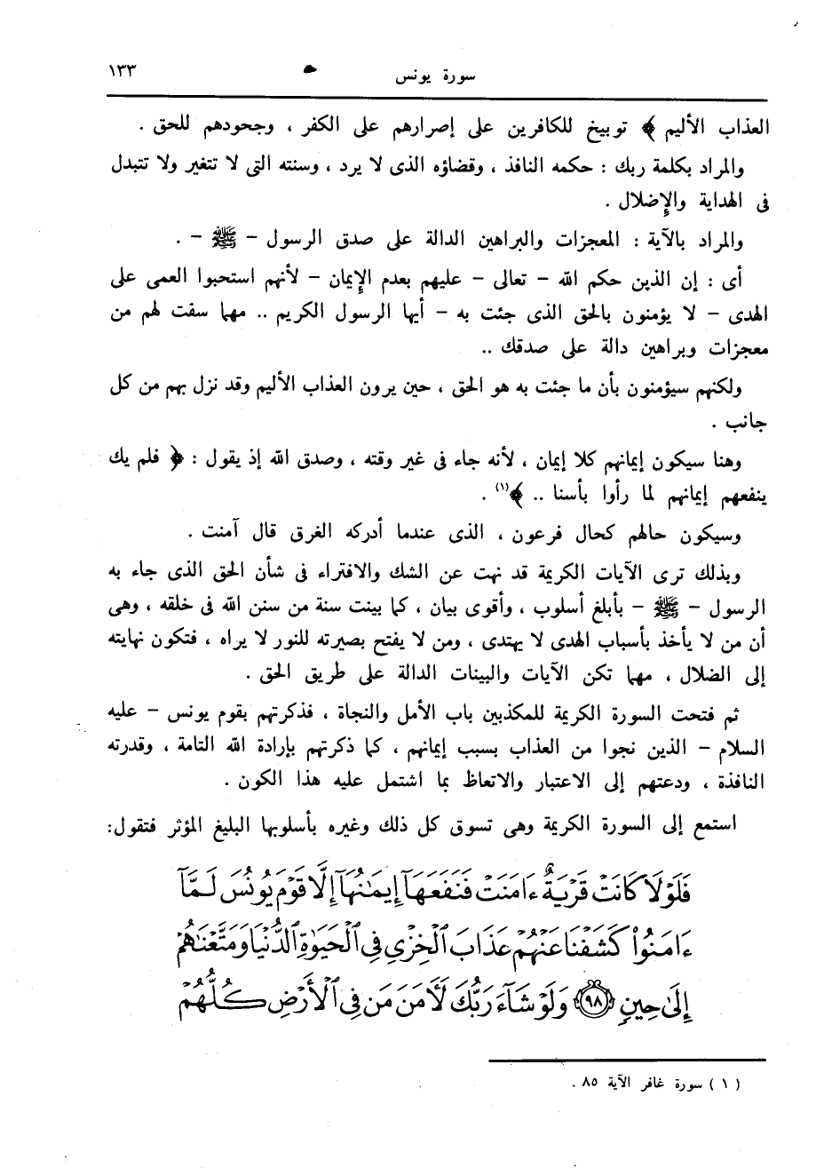 ثم فتحت السورة الكريمة للمكذبين باب الأمل والنجاة، فذكرتهم بقوم يونس- عليه السلام- الذين نجوا من العذاب بسبب إيمانهم، كما ذكرتهم بإرادة الله التامة، وقدرته النافذة، ودعتهم إلى الاعتبار والاتعاظ بما اشتمل عليه هذا الكون.