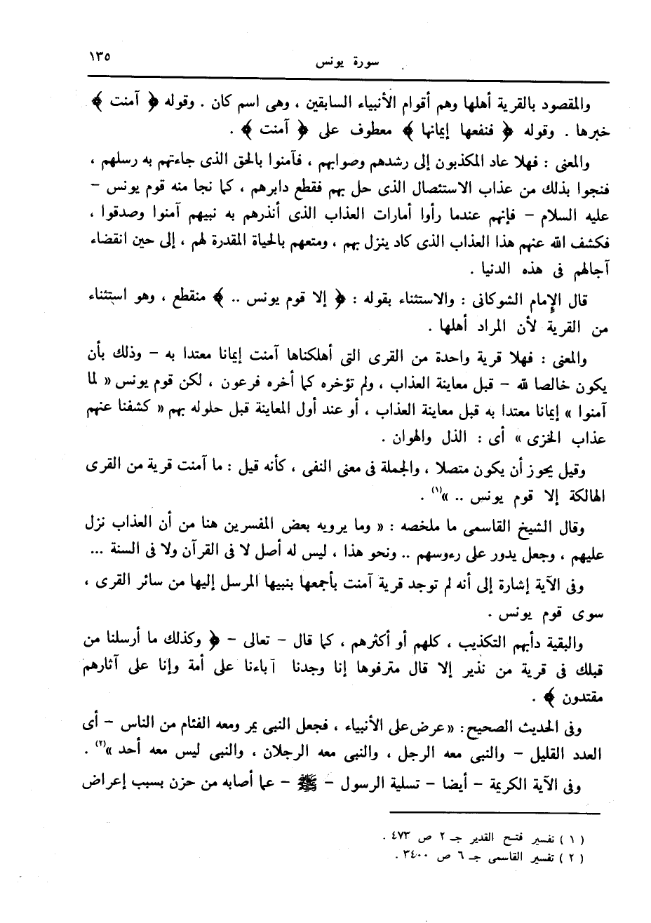 قال الإمام الشوكانى: والاستثناء بقوله: إِلَّا قَوْمَ يُونُسَ.. منقطع، وهو استثناء من القرية لأن المراد أهلها.