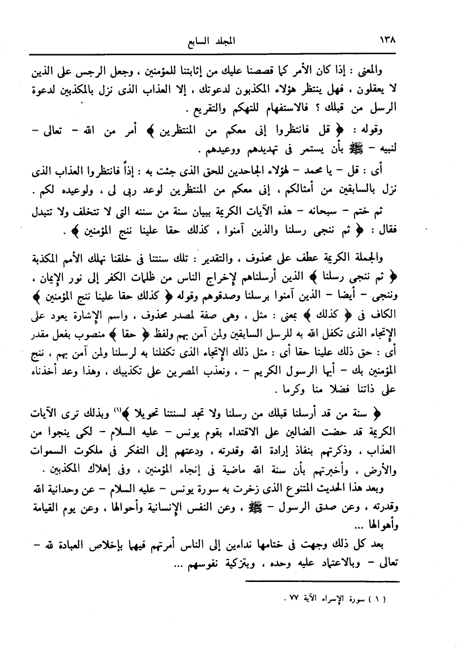 سُنَّةَ مَنْ قَدْ أَرْسَلْنا قَبْلَكَ مِنْ رُسُلِنا وَلا تَجِدُ لِسُنَّتِنا تَحْوِيلًا «1» وبذلك ترى الآيات الكريمة قد حضت الضالين على الاقتداء بقوم يونس- عليه السلام- لكي ينجوا من العذاب، وذكرتهم بنفاذ إرادة الله وقدرته، ودعتهم إلى التفكر في ملكوت السموات والأرض، وأخبرتهم بأن سنة الله ماضية في إنجاء المؤمنين، وفي إهلاك المكذبين.