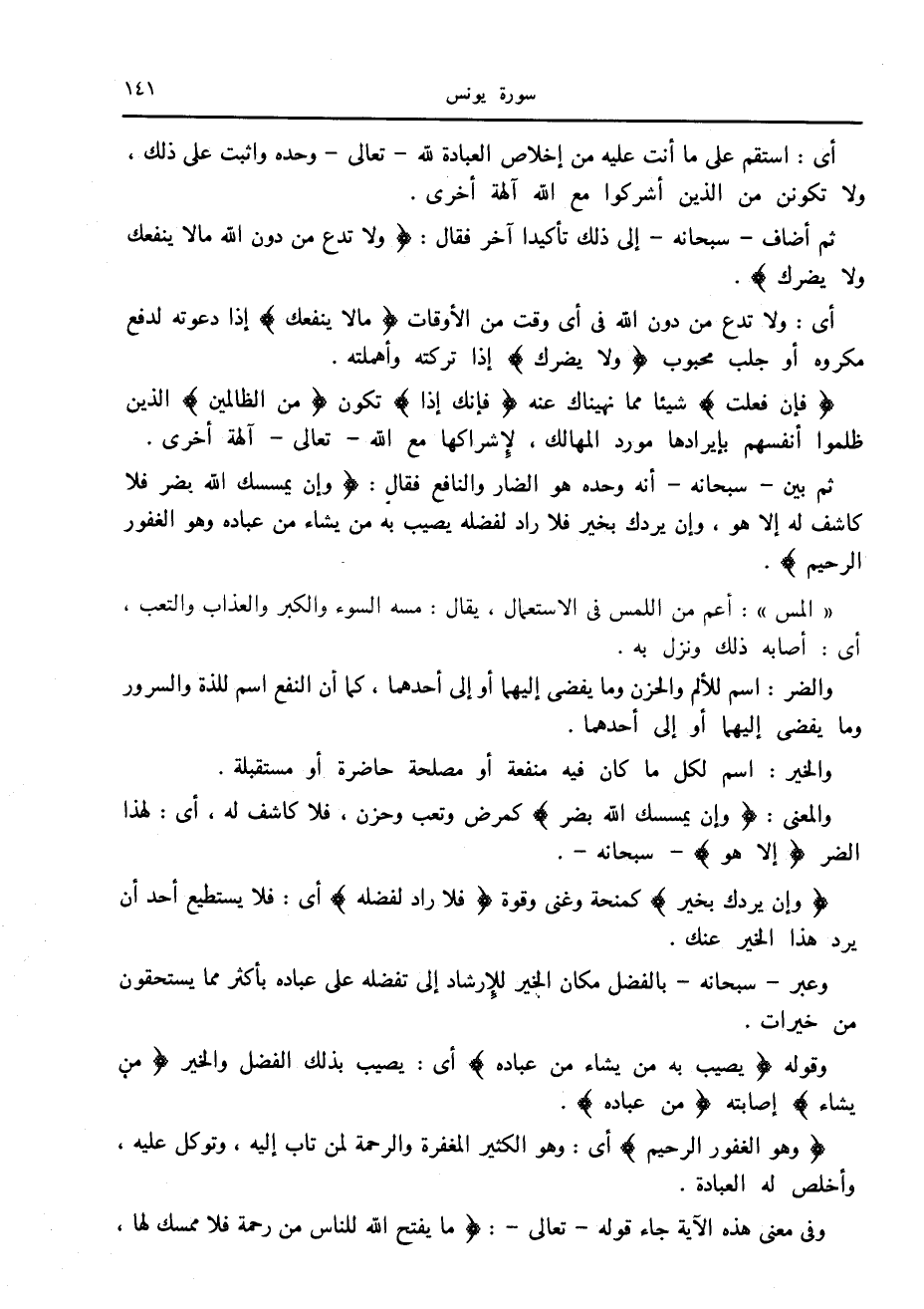 ثم بين- سبحانه- أنه وحده هو الضار والنافع فقال: وَإِنْ يَمْسَسْكَ اللَّهُ بِضُرٍّ فَلا كاشِفَ لَهُ إِلَّا هُوَ، وَإِنْ يُرِدْكَ بِخَيْرٍ فَلا رَادَّ لِفَضْلِهِ يُصِيبُ بِهِ مَنْ يَشاءُ مِنْ عِبادِهِ وَهُوَ الْغَفُورُ الرَّحِيمُ.