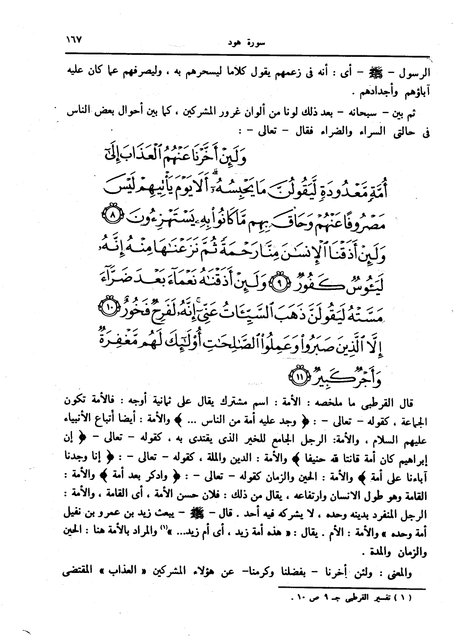وَلَئِنْ أَخَّرْنا عَنْهُمُ الْعَذابَ إِلى أُمَّةٍ مَعْدُودَةٍ لَيَقُولُنَّ ما يَحْبِسُهُ أَلا يَوْمَ يَأْتِيهِمْ لَيْسَ مَصْرُوفاً عَنْهُمْ وَحاقَ بِهِمْ ما كانُوا بِهِ يَسْتَهْزِؤُنَ (8) وَلَئِنْ أَذَقْنَا الْإِنْسانَ مِنَّا رَحْمَةً ثُمَّ نَزَعْناها مِنْهُ إِنَّهُ لَيَؤُسٌ كَفُورٌ (9) وَلَئِنْ أَذَقْناهُ نَعْماءَ بَعْدَ ضَرَّاءَ مَسَّتْهُ لَيَقُولَنَّ ذَهَبَ السَّيِّئاتُ عَنِّي إِنَّهُ لَفَرِحٌ فَخُورٌ (10) إِلاَّ الَّذِينَ صَبَرُوا وَعَمِلُوا الصَّالِحاتِ أُولئِكَ لَهُمْ مَغْفِرَةٌ وَأَجْرٌ كَبِيرٌ (11)