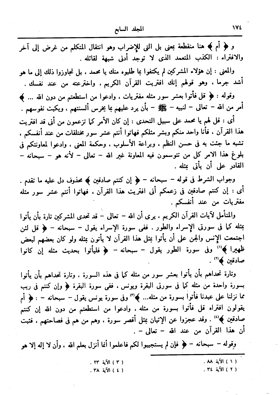وتارة تحداهم بأن يأتوا بعشر سور من مثله كما في هذه السورة، وتارة تحداهم بأن يأتوا بسورة واحدة من مثله كما في سورتي البقرة ويونس، ففي سورة البقرة وَإِنْ كُنْتُمْ فِي رَيْبٍ مِمَّا نَزَّلْنا عَلى عَبْدِنا فَأْتُوا بِسُورَةٍ مِنْ مِثْلِهِ ... «3» وفي سورة يونس يقول- سبحانه-: أَمْ يَقُولُونَ افْتَراهُ قُلْ فَأْتُوا بِسُورَةٍ مِثْلِهِ، وَادْعُوا مَنِ اسْتَطَعْتُمْ مِنْ دُونِ اللَّهِ إِنْ كُنْتُمْ صادِقِينَ «4» . وقد عجزوا عن الإتيان بمثل أقصر سورة، وهم من هم في فصاحتهم، فثبت أن هذا القرآن من عند الله- تعالى-.