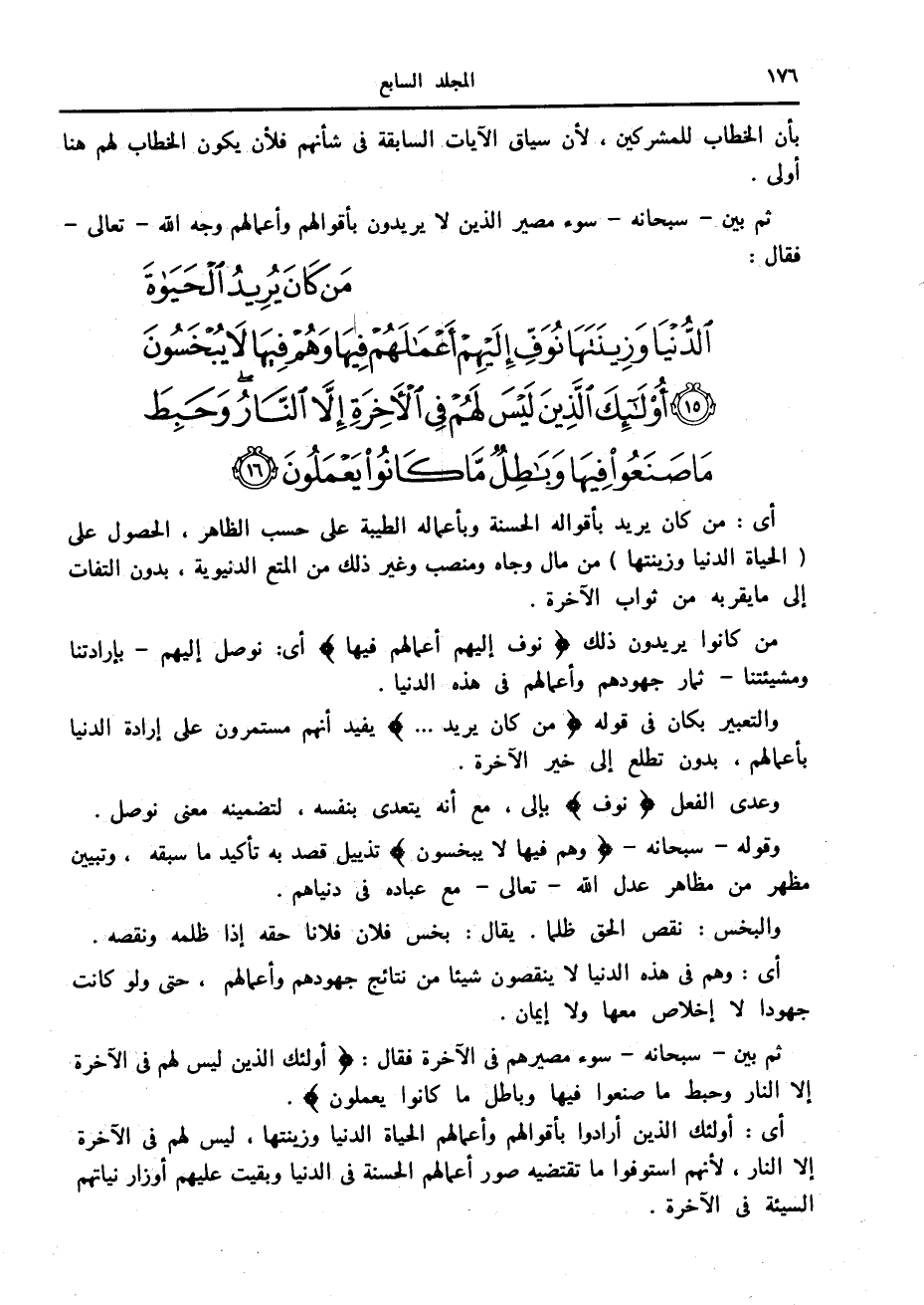 مَنْ كانَ يُرِيدُ الْحَياةَ الدُّنْيا وَزِينَتَها نُوَفِّ إِلَيْهِمْ أَعْمالَهُمْ فِيها وَهُمْ فِيها لا يُبْخَسُونَ (15) أُولئِكَ الَّذِينَ لَيْسَ لَهُمْ فِي الْآخِرَةِ إِلاَّ النَّارُ وَحَبِطَ ما صَنَعُوا فِيها وَباطِلٌ ما كانُوا يَعْمَلُونَ (16)