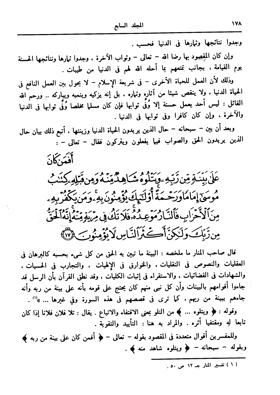 أَفَمَنْ كانَ عَلى بَيِّنَةٍ مِنْ رَبِّهِ وَيَتْلُوهُ شاهِدٌ مِنْهُ وَمِنْ قَبْلِهِ كِتابُ مُوسى إِماماً وَرَحْمَةً أُولئِكَ يُؤْمِنُونَ بِهِ وَمَنْ يَكْفُرْ بِهِ مِنَ الْأَحْزابِ فَالنَّارُ مَوْعِدُهُ فَلا تَكُ فِي مِرْيَةٍ مِنْهُ إِنَّهُ الْحَقُّ مِنْ رَبِّكَ وَلكِنَّ أَكْثَرَ النَّاسِ لا يُؤْمِنُونَ (17)