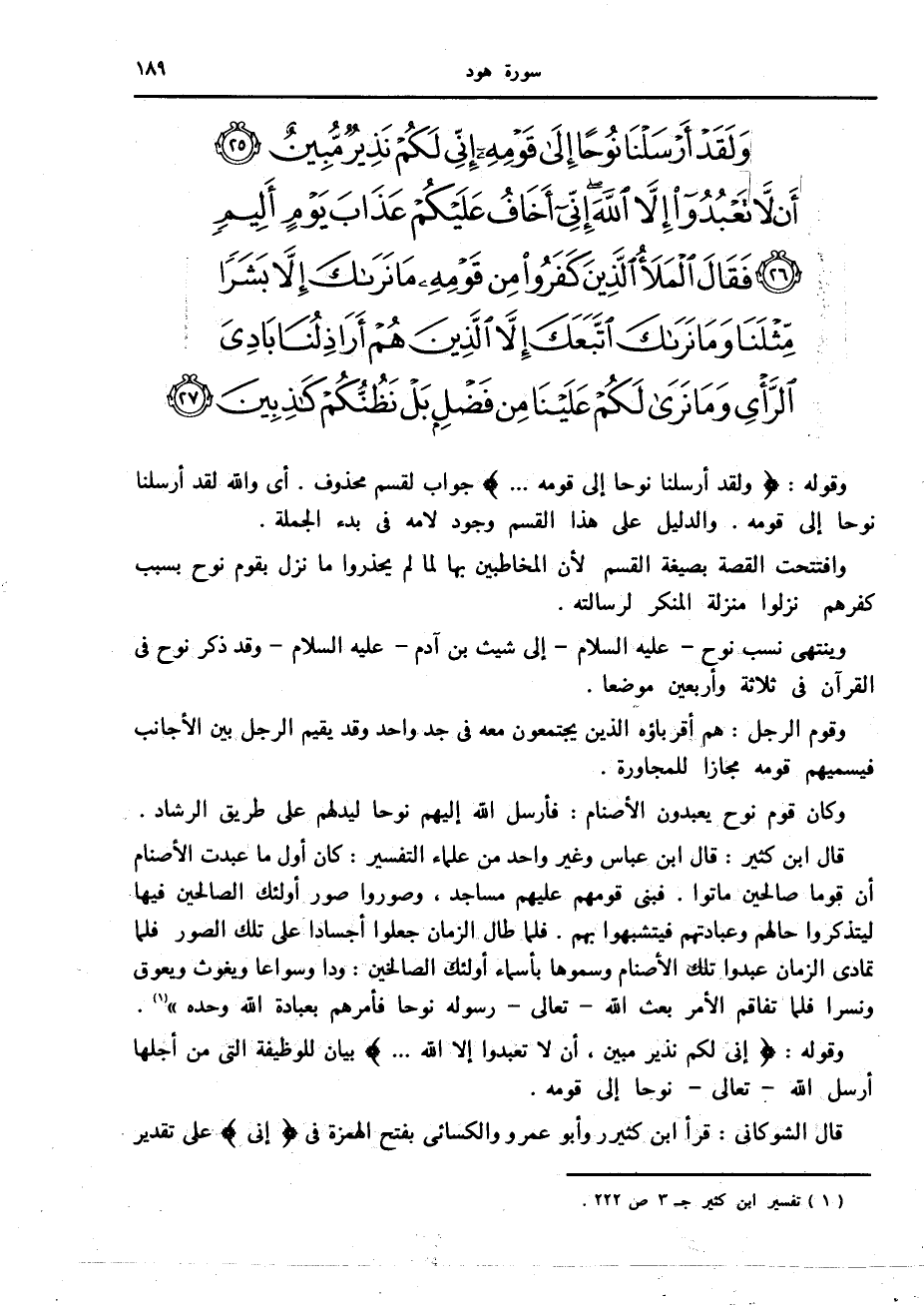 وَلَقَدْ أَرْسَلْنا نُوحاً إِلى قَوْمِهِ إِنِّي لَكُمْ نَذِيرٌ مُبِينٌ (25) أَنْ لا تَعْبُدُوا إِلاَّ اللَّهَ إِنِّي أَخافُ عَلَيْكُمْ عَذابَ يَوْمٍ أَلِيمٍ (26) فَقالَ الْمَلَأُ الَّذِينَ كَفَرُوا مِنْ قَوْمِهِ ما نَراكَ إِلاَّ بَشَراً مِثْلَنا وَما نَراكَ اتَّبَعَكَ إِلاَّ الَّذِينَ هُمْ أَراذِلُنا بادِيَ الرَّأْيِ وَما نَرى لَكُمْ عَلَيْنا مِنْ فَضْلٍ بَلْ نَظُنُّكُمْ كاذِبِينَ (27)