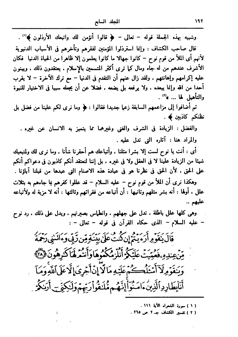 قال صاحب الكشاف: وإنما استرذلوا المؤمنين لفقرهم وتأخرهم في الأسباب الدنيوية لأنهم أى الملأ من قوم نوح- كانوا جهالا ما كانوا يعلمون إلا ظاهرا من الحياة الدنيا فكان الأشرف عندهم من له جاه ومال كما ترى أكثر المتسمين بالإسلام، يعتقدون ذلك، ويبنون عليه إكرامهم وإهانتهم، ولقد زال عنهم أن التقدم في الدنيا- مع ترك الآخرة- لا يقرب أحدا من الله وإنما يبعده، ولا يرفعه بل يضعه، فضلا عن أن يجعله سببا في الاختيار للنبوة والتأهيل لها ... » «2» .