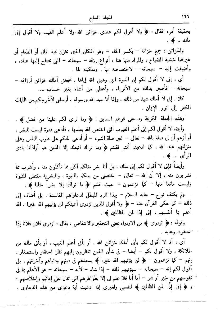 وأيضا لا أقول لكم إنى أعلم الغيوب التي اختص الله بعلمها، فأدعى قدرة ليست للبشر، أو أزعم أن لي صلة بالله- تعالى- غير صلة النبوة- أو أدعى الحكم على قلوب الناس وعلى منزلتهم عند الله، كما ادعيتم أنتم فقلتم وَما نَراكَ اتَّبَعَكَ إِلَّا الَّذِينَ هُمْ أَراذِلُنا بادِيَ الرَّأْيِ....