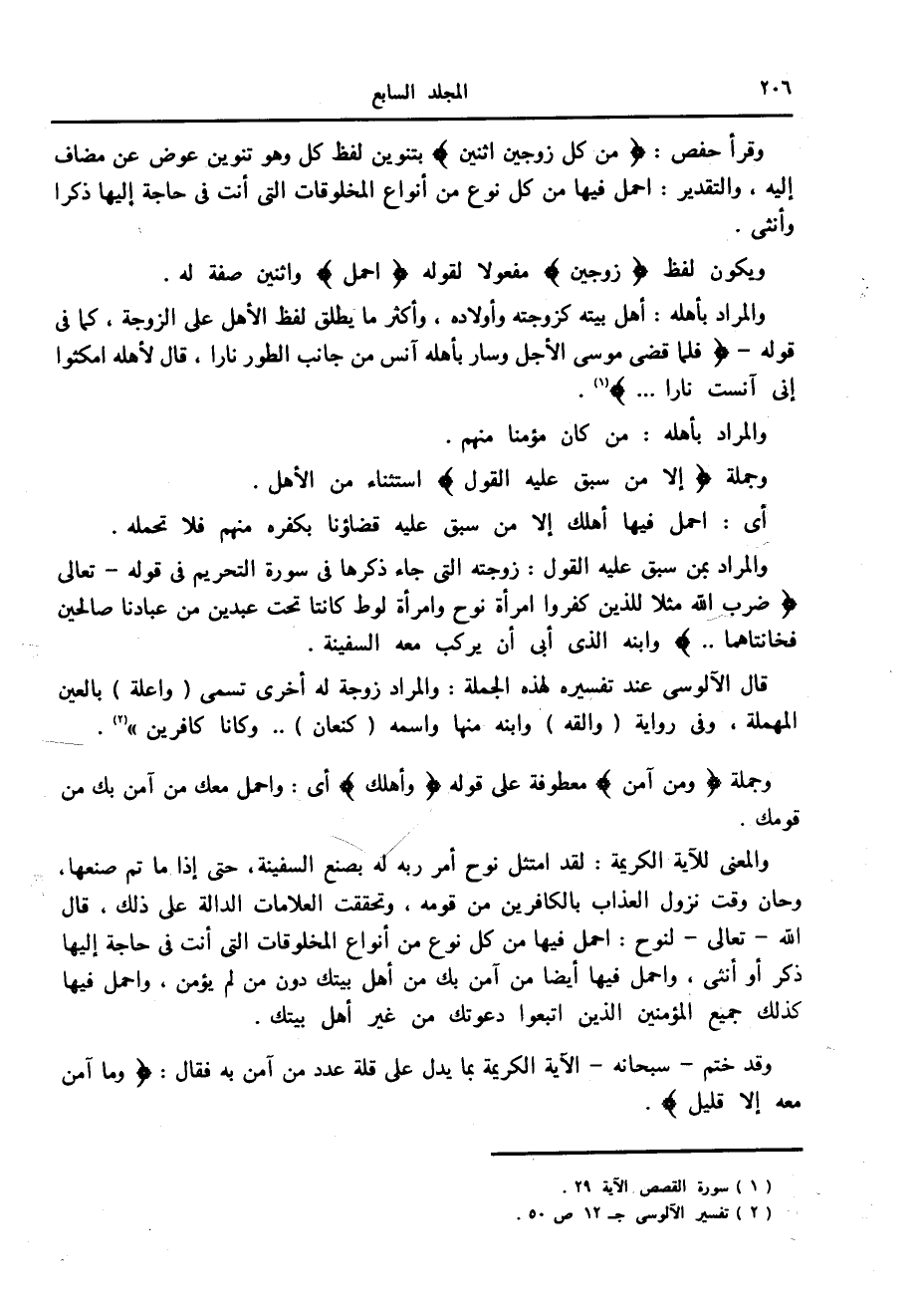 والمعنى للآية الكريمة: لقد امتثل نوح أمر ربه له بصنع السفينة، حتى إذا ما تم صنعها، وحان وقت نزول العذاب بالكافرين من قومه، وتحققت العلامات الدالة على ذلك، قال الله- تعالى- لنوح: احمل فيها من كل نوع من أنواع المخلوقات التي أنت في حاجة إليها ذكرا وأنثى، واحمل فيها أيضا من آمن بك من أهل بيتك دون من لم يؤمن، واحمل فيها كذلك جميع المؤمنين الذين اتبعوا دعوتك من غير أهل بيتك.