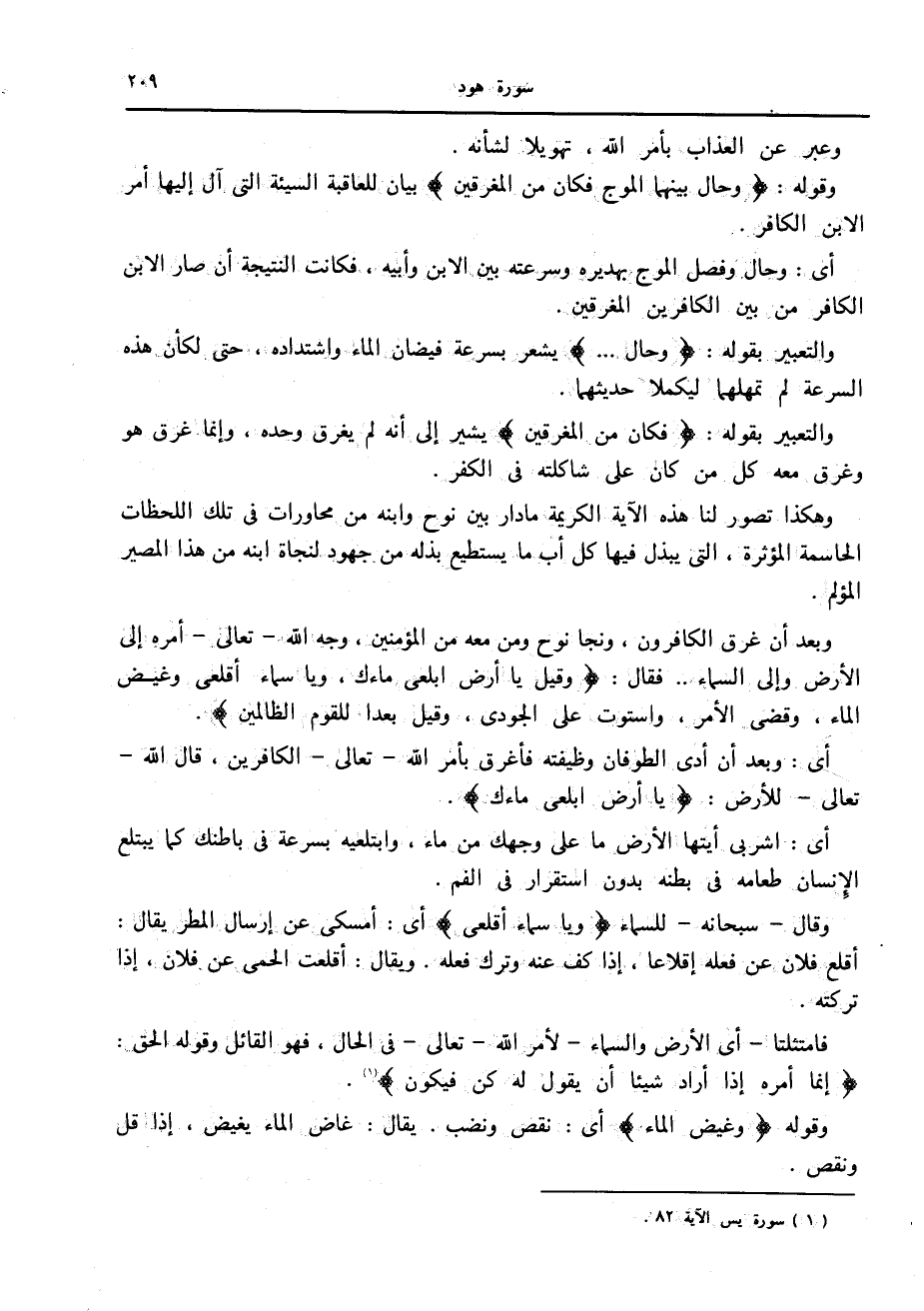 وهكذا تصور لنا هذه الآية الكريمة ما دار بين نوح وابنه من محاورات في تلك اللحظات الحاسمة المؤثرة، التي يبذل فيها كل أب ما يستطيع بذله من جهود لنجاة ابنه من هذا المصير المؤلم.