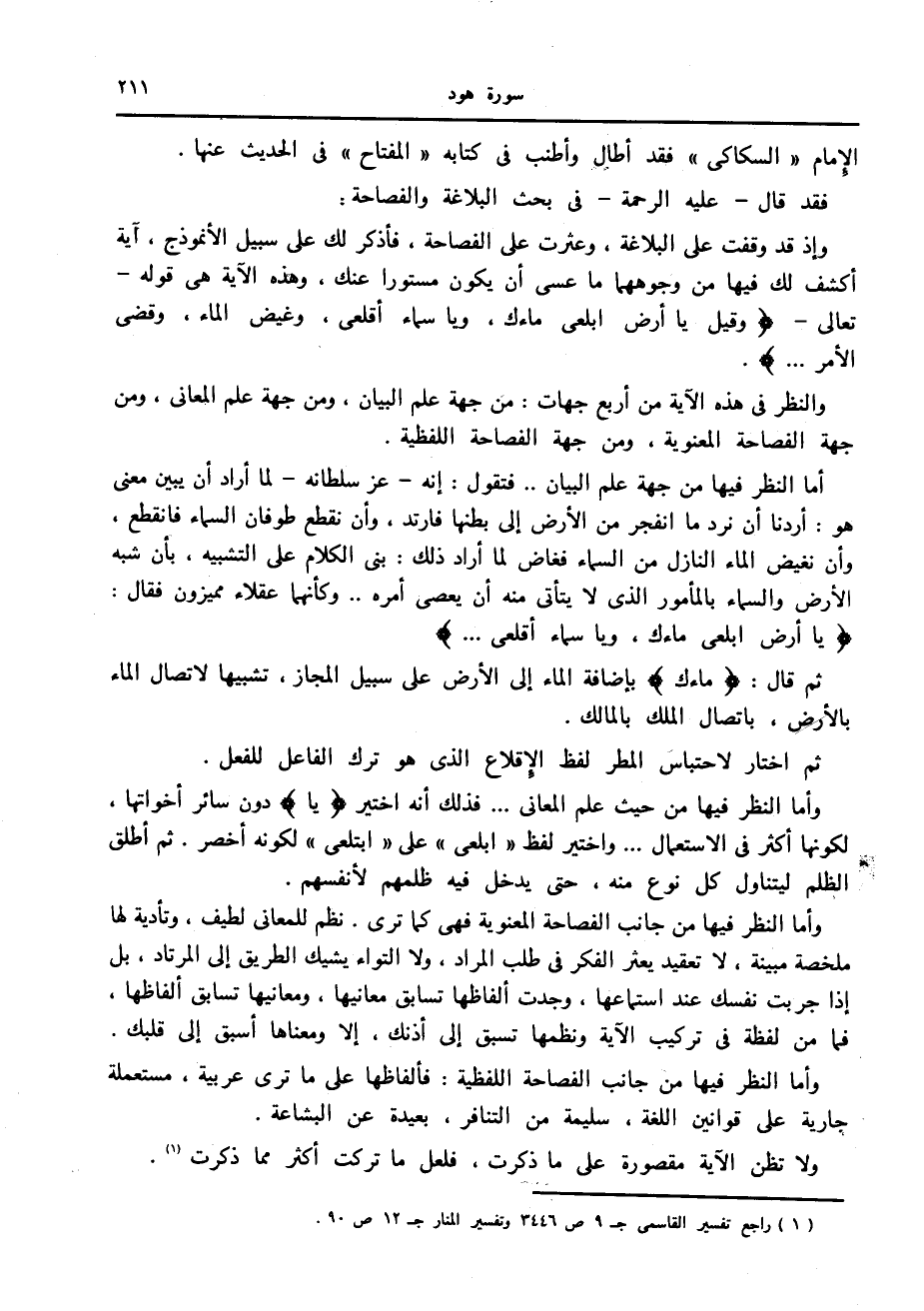 وإذ قد وقفت على البلاغة، وعثرت على الفصاحة، فأذكر لك على سبيل الأنموذج، آية أكشف لك فيها من وجوههما ما عسى أن يكون مستورا عنك، وهذه الآية هي قوله- تعالى- وَقِيلَ يا أَرْضُ ابْلَعِي ماءَكِ، وَيا سَماءُ أَقْلِعِي، وَغِيضَ الْماءُ، وَقُضِيَ الْأَمْرُ....