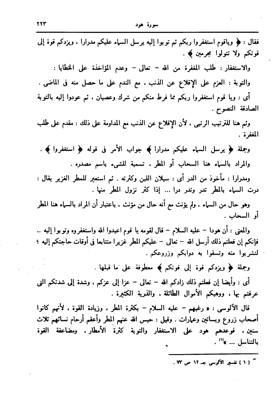 قال الآلوسى: «رغبهم- عليه السلام- بكثرة المطر، وزيادة القوة، لأنهم كانوا أصحاب زروع وبساتين وعمارات. وقيل: حبس الله عنهم المطر وأعقم أرحام نسائهم ثلاث سنين، فوعدهم هود على الاستغفار والتوبة كثرة الأمطار، ومضاعفة القوة بالتناسل ... » «1» .