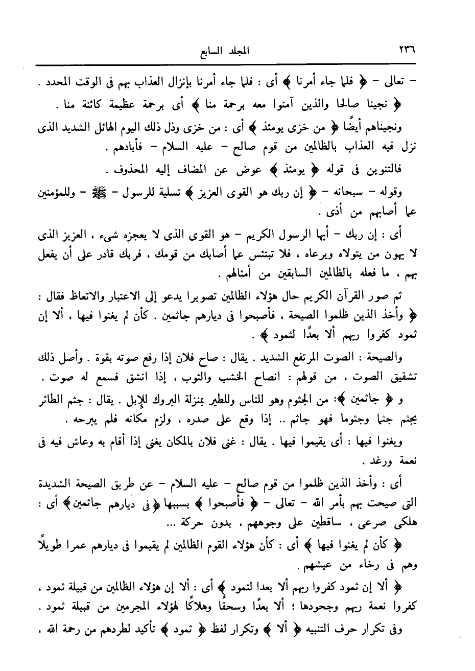 وَأَخَذَ الَّذِينَ ظَلَمُوا الصَّيْحَةُ، فَأَصْبَحُوا فِي دِيارِهِمْ جاثِمِينَ. كَأَنْ لَمْ يَغْنَوْا فِيها، أَلا إِنَّ ثَمُودَ كَفَرُوا رَبَّهُمْ أَلا بُعْداً لِثَمُودَ.