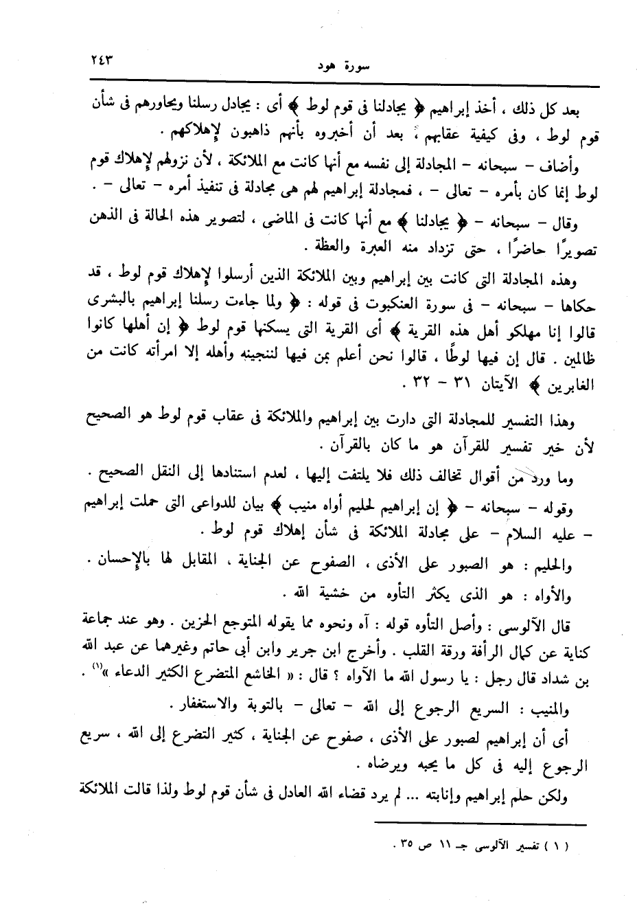 وهذه المجادلة التي كانت بين إبراهيم وبين الملائكة الذين أرسلوا لإهلاك قوم لوط، قد حكاها- سبحانه- في سورة العنكبوت في قوله: وَلَمَّا جاءَتْ رُسُلُنا إِبْراهِيمَ بِالْبُشْرى قالُوا إِنَّا مُهْلِكُوا أَهْلِ هذِهِ الْقَرْيَةِ أى القرية التي يسكنها قوم لوط إِنَّ أَهْلَها كانُوا ظالِمِينَ. قالَ إِنَّ فِيها لُوطاً، قالُوا نَحْنُ أَعْلَمُ بِمَنْ فِيها لَنُنَجِّيَنَّهُ وَأَهْلَهُ إِلَّا امْرَأَتَهُ كانَتْ مِنَ الْغابِرِينَ الآيتان 31- 32.