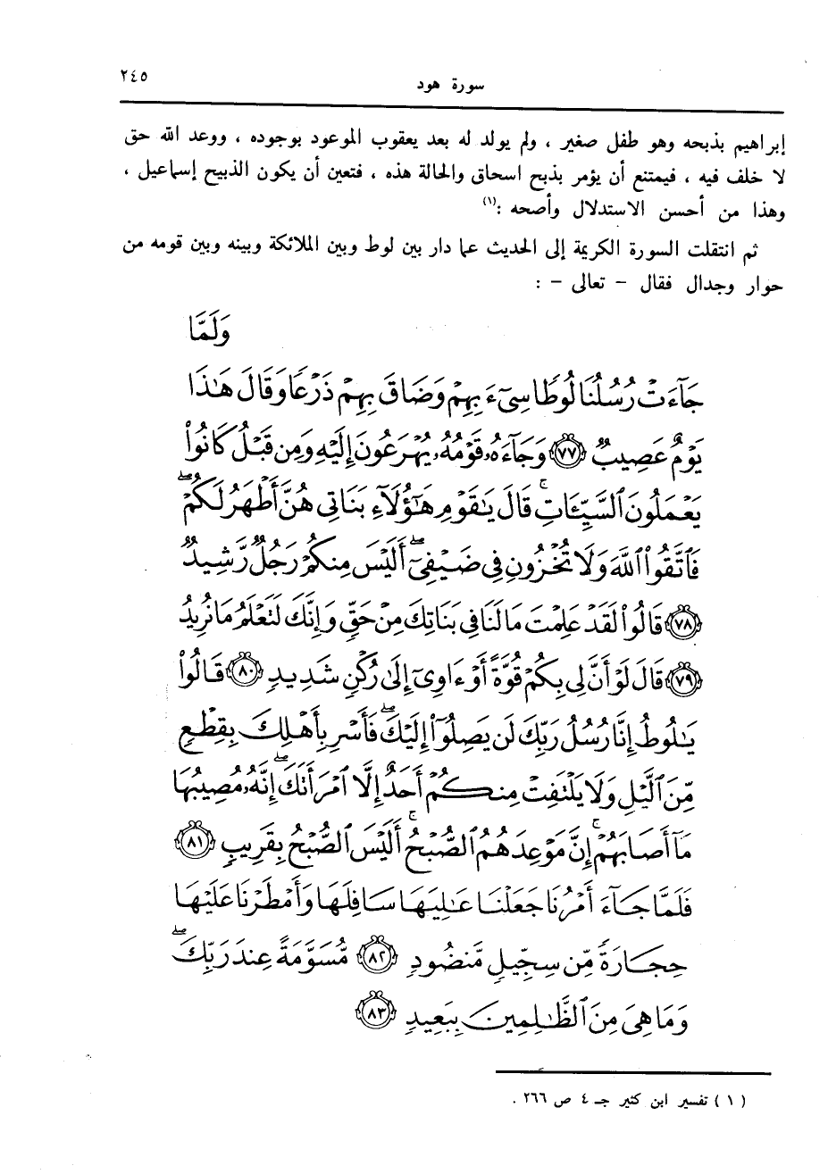 وَلَمَّا جاءَتْ رُسُلُنا لُوطاً سِيءَ بِهِمْ وَضاقَ بِهِمْ ذَرْعاً وَقالَ هذا يَوْمٌ عَصِيبٌ (77) وَجاءَهُ قَوْمُهُ يُهْرَعُونَ إِلَيْهِ وَمِنْ قَبْلُ كانُوا يَعْمَلُونَ السَّيِّئاتِ قالَ يا قَوْمِ هؤُلاءِ بَناتِي هُنَّ أَطْهَرُ لَكُمْ فَاتَّقُوا اللَّهَ وَلا تُخْزُونِ فِي ضَيْفِي أَلَيْسَ مِنْكُمْ رَجُلٌ رَشِيدٌ (78) قالُوا لَقَدْ عَلِمْتَ ما لَنا فِي بَناتِكَ مِنْ حَقٍّ وَإِنَّكَ لَتَعْلَمُ ما نُرِيدُ (79) قالَ لَوْ أَنَّ لِي بِكُمْ قُوَّةً أَوْ آوِي إِلى رُكْنٍ شَدِيدٍ (80) قالُوا يا لُوطُ إِنَّا رُسُلُ رَبِّكَ لَنْ يَصِلُوا إِلَيْكَ فَأَسْرِ بِأَهْلِكَ بِقِطْعٍ مِنَ اللَّيْلِ وَلا يَلْتَفِتْ مِنْكُمْ أَحَدٌ إِلاَّ امْرَأَتَكَ إِنَّهُ مُصِيبُها ما أَصابَهُمْ إِنَّ مَوْعِدَهُمُ الصُّبْحُ أَلَيْسَ الصُّبْحُ بِقَرِيبٍ (81)