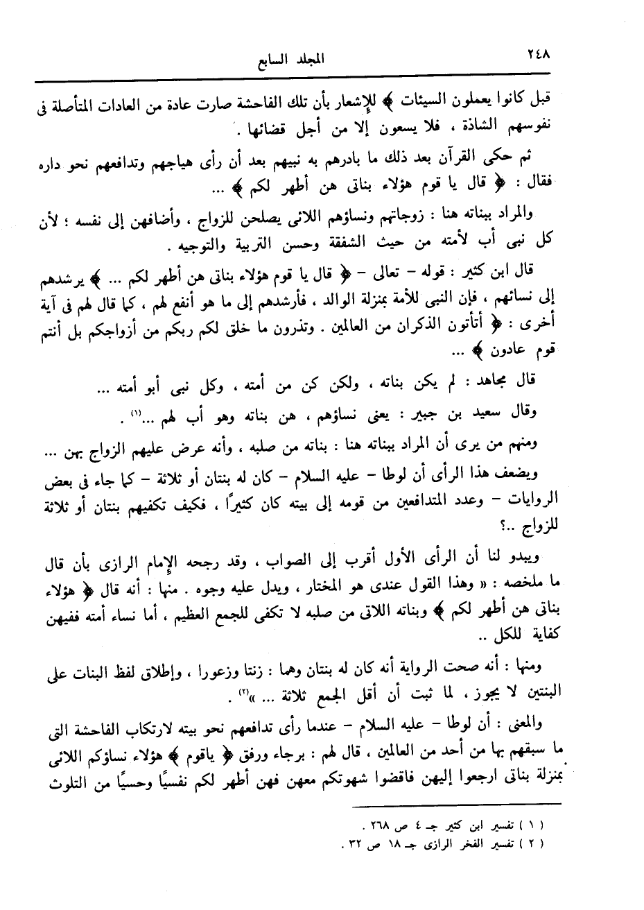 ويبدو لنا أن الرأى الأول أقرب إلى الصواب، وقد رجحه الإمام الرازي بأن قال ما ملخصه: «وهذا القول عندي هو المختار، ويدل عليه وجوه. منها: أنه قال هؤُلاءِ بَناتِي هُنَّ أَطْهَرُ لَكُمْ وبناته اللاتي من صلبه لا تكفى للجمع العظيم، أما نساء أمته ففيهن كفاية للكل..