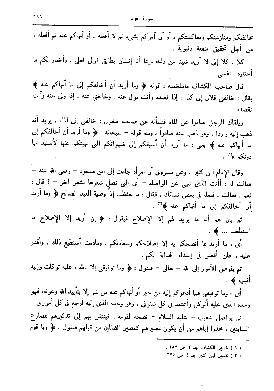 قال صاحب الكشاف ما ملخصه: قوله وَما أُرِيدُ أَنْ أُخالِفَكُمْ إِلى ما أَنْهاكُمْ عَنْهُ يقال: خالفني فلان إلى كذا: إذا قصده وأنت مول عنه. وخالفني عنه: إذا ولى عنه وأنت تقصده.