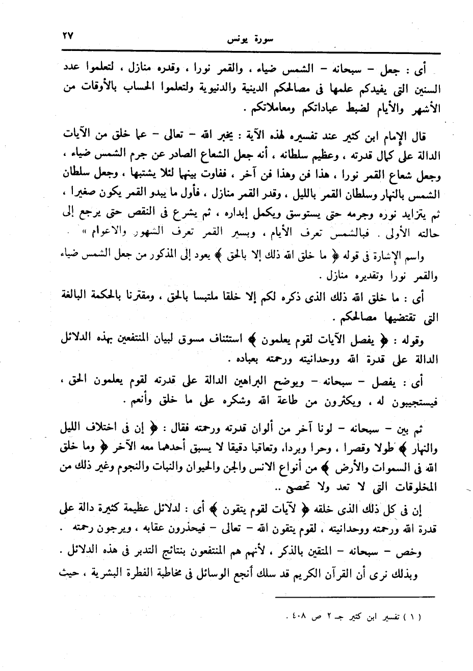 قال الإمام ابن كثير عند تفسيره لهذه الآية: يخبر الله- تعالى- عما خلق من الآيات الدالة على كمال قدرته، وعظيم سلطانه، أنه جعل الشعاع الصادر عن جرم الشمس ضياء، وجعل شعاع القمر نورا، هذا فن وهذا فن آخر، ففاوت بينهما لئلا يشتبها، وجعل سلطان الشمس بالنهار وسلطان القمر بالليل، وقدر القمر منازل، فأول ما يبدو القمر يكون صغيرا، ثم يتزايد نوره وجرمه حتى يستوسق ويكمل إبداره، ثم يشرع في النقص حتى يرجع إلى حالته الأولى. فبالشمس تعرف الأيام، وبسير القمر تعرف الشهور والأعوام» . «1»