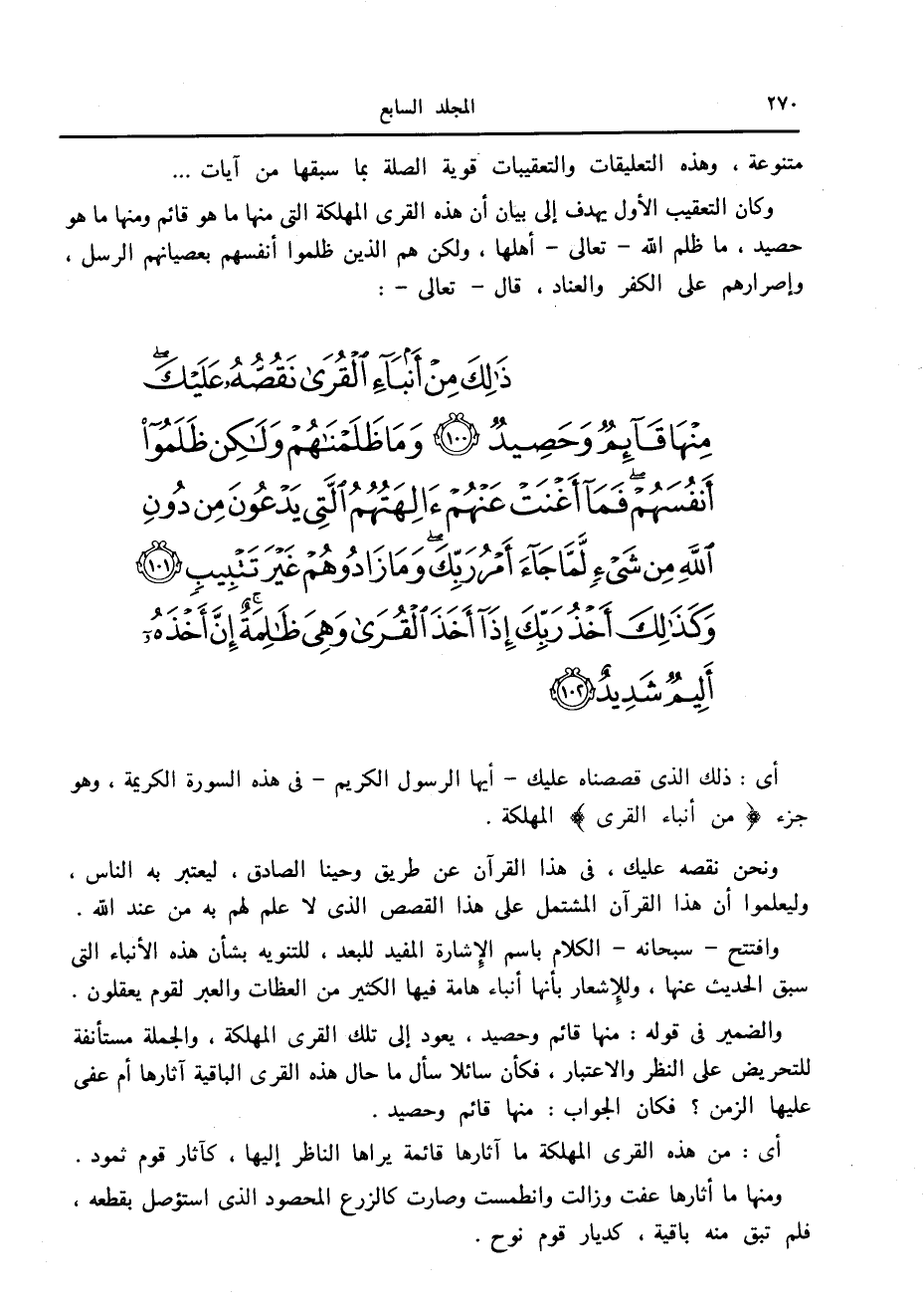 ذلِكَ مِنْ أَنْباءِ الْقُرى نَقُصُّهُ عَلَيْكَ مِنْها قائِمٌ وَحَصِيدٌ (100) وَما ظَلَمْناهُمْ وَلكِنْ ظَلَمُوا أَنْفُسَهُمْ فَما أَغْنَتْ عَنْهُمْ آلِهَتُهُمُ الَّتِي يَدْعُونَ مِنْ دُونِ اللَّهِ مِنْ شَيْءٍ لَمَّا جاءَ أَمْرُ رَبِّكَ وَما زادُوهُمْ غَيْرَ تَتْبِيبٍ (101) وَكَذلِكَ أَخْذُ رَبِّكَ إِذا أَخَذَ الْقُرى وَهِيَ ظالِمَةٌ إِنَّ أَخْذَهُ أَلِيمٌ شَدِيدٌ (102)