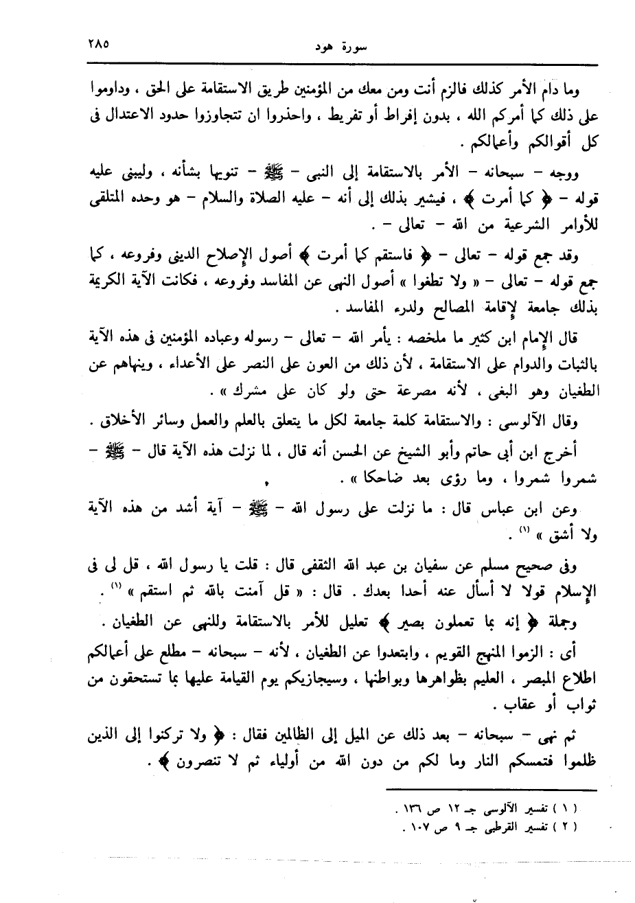 قال الإمام ابن كثير ما ملخصه: يأمر الله- تعالى- رسوله وعباده المؤمنين في هذه الآية بالثبات والدوام على الاستقامة، لأن ذلك من أكبر العون على النصر على الأعداء، وينهاهم عن الطغيان وهو البغي، لأنه مصرعة حتى ولو كان على مشرك» .