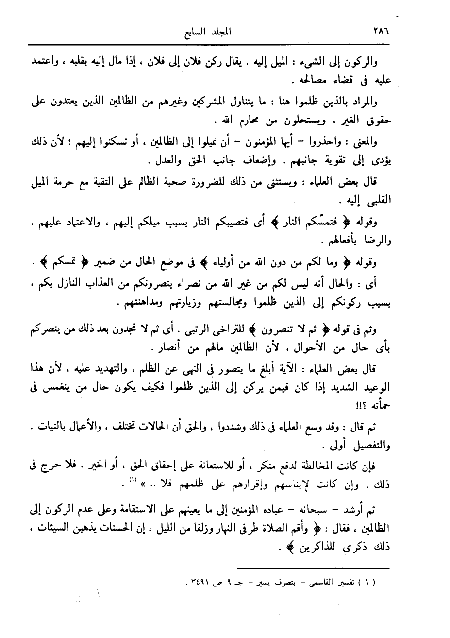 قال بعض العلماء: الآية أبلغ ما يتصور في النهى عن الظلم، والتهديد عليه، لأن هذا الوعيد الشديد إذا كان فيمن يركن إلى الذين ظلموا فكيف يكون حال من ينغمس في حمأته؟!! ثم قال: وقد وسع العلماء في ذلك وشددوا، والحق أن الحالات تختلف، والأعمال بالنيات.