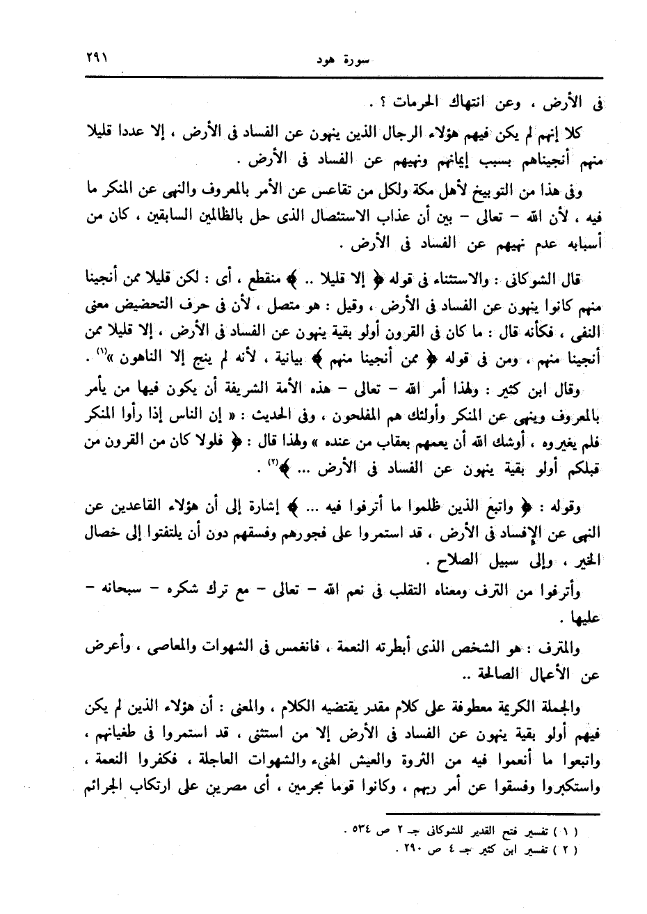 وقال ابن كثير: ولهذا أمر الله- تعالى- هذه الأمة الشريفة أن يكون فيها من يأمر بالمعروف وينهى عن المنكر وأولئك هم المفلحون، وفي الحديث: «إن الناس إذا رأوا المنكر فلم يغيروه، أوشك الله أن يعمهم بعقاب من عنده» ولهذا قال: فَلَوْلا كانَ مِنَ الْقُرُونِ مِنْ قَبْلِكُمْ أُولُوا بَقِيَّةٍ يَنْهَوْنَ عَنِ الْفَسادِ فِي الْأَرْضِ ... «2» .