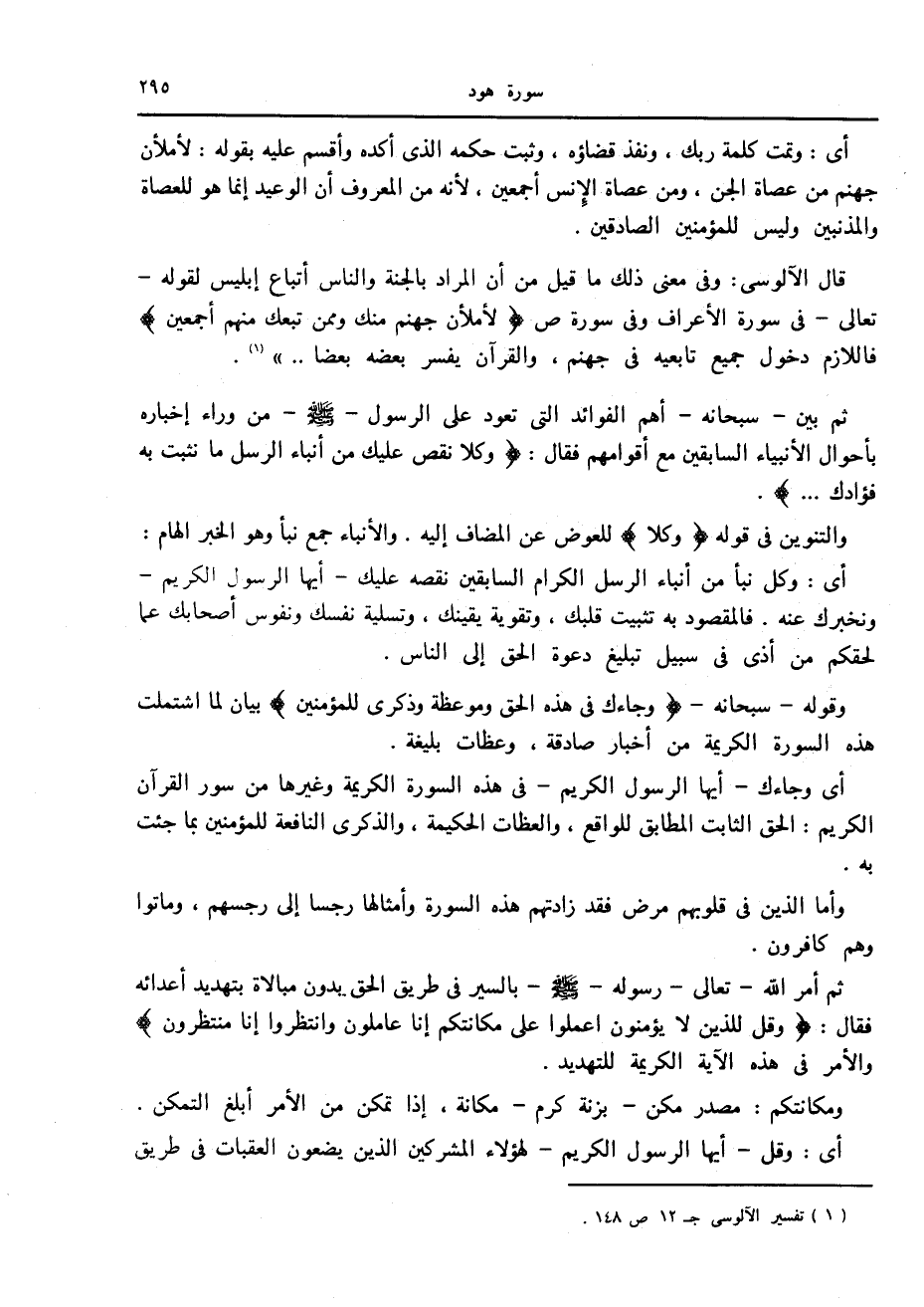 قال الآلوسى: وفي معنى ذلك ما قيل من أن المراد بالجنة والناس أتباع إبليس لقوله- تعالى- في سورة الأعراف وفي سورة ص لَأَمْلَأَنَّ جَهَنَّمَ مِنْكَ وَمِمَّنْ تَبِعَكَ مِنْهُمْ أَجْمَعِينَ فاللازم دخول جميع تابعيه في جهنم، والقرآن يفسر بعضه بعضا ... » «1» .