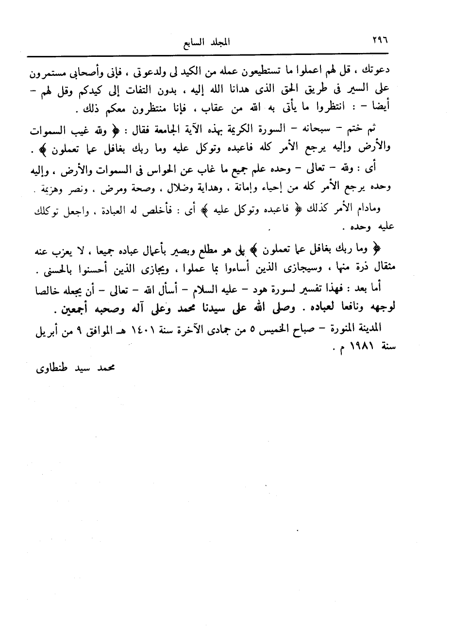 أما بعد: فهذا تفسير لسورة هود- عليه السلام- أسأل الله- تعالى- أن يجعله خالصا لوجهه ونافعا لعباده. وصلى الله على سيدنا محمد وعلى آله وصحبه أجمعين.