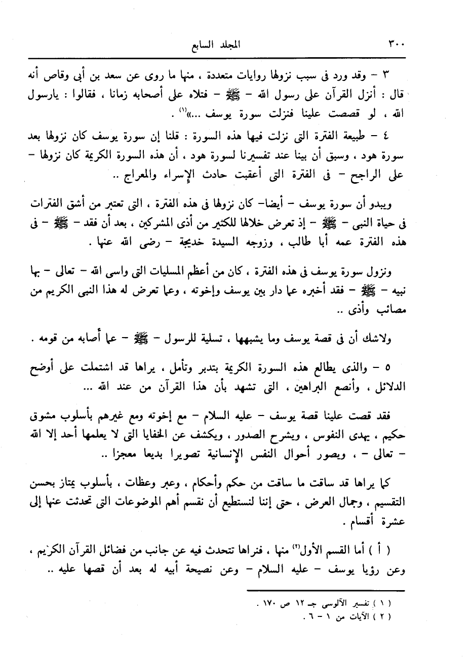 (أ) أما القسم الأول «2» منها، فنراها تتحدث فيه عن جانب من فضائل القرآن الكريم، وعن رؤيا يوسف- عليه السلام- وعن نصيحة أبيه له بعد أن قصها عليه ...