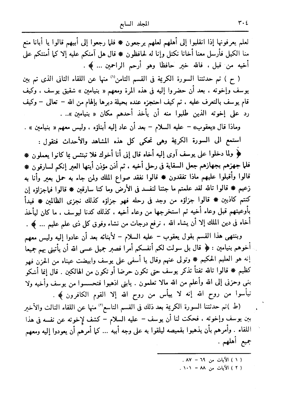 (ح) ثم حدثتنا السورة الكريمة في القسم الثامن «1» منها عن اللقاء الثاني الذي تم بين يوسف وإخوته، بعد أن حضروا إليه في هذه المرة ومعهم «بنيامين» شقيق يوسف، وكيف قام يوسف بالتعرف عليه، ثم كيف احتجزه عنده بحيلة دبرها بإلهام من الله- تعالى- وكيف رد على إخوته الذين طلبوا منه أن يأخذ أحدهم مكان «بنيامين» ...