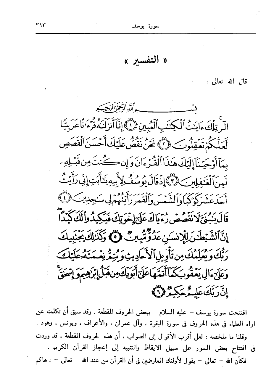 الر تِلْكَ آياتُ الْكِتابِ الْمُبِينِ (1) إِنَّا أَنْزَلْناهُ قُرْآناً عَرَبِيًّا لَعَلَّكُمْ تَعْقِلُونَ (2) نَحْنُ نَقُصُّ عَلَيْكَ أَحْسَنَ الْقَصَصِ بِما أَوْحَيْنا إِلَيْكَ هذَا الْقُرْآنَ وَإِنْ كُنْتَ مِنْ قَبْلِهِ لَمِنَ الْغافِلِينَ (3) إِذْ قالَ يُوسُفُ لِأَبِيهِ يا أَبَتِ إِنِّي رَأَيْتُ أَحَدَ عَشَرَ كَوْكَباً وَالشَّمْسَ وَالْقَمَرَ رَأَيْتُهُمْ لِي ساجِدِينَ (4)