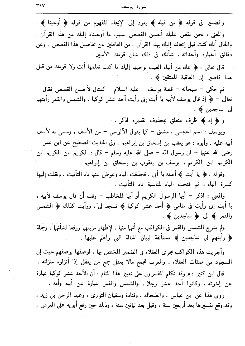 ثم حكى- سبحانه- قصة يوسف- عليه السلام- كمثال لأحسن القصص فقال- تعالى- إِذْ قالَ يُوسُفُ لِأَبِيهِ يا أَبَتِ إِنِّي رَأَيْتُ أَحَدَ عَشَرَ كَوْكَباً، وَالشَّمْسَ وَالْقَمَرَ رَأَيْتُهُمْ لِي ساجِدِينَ.