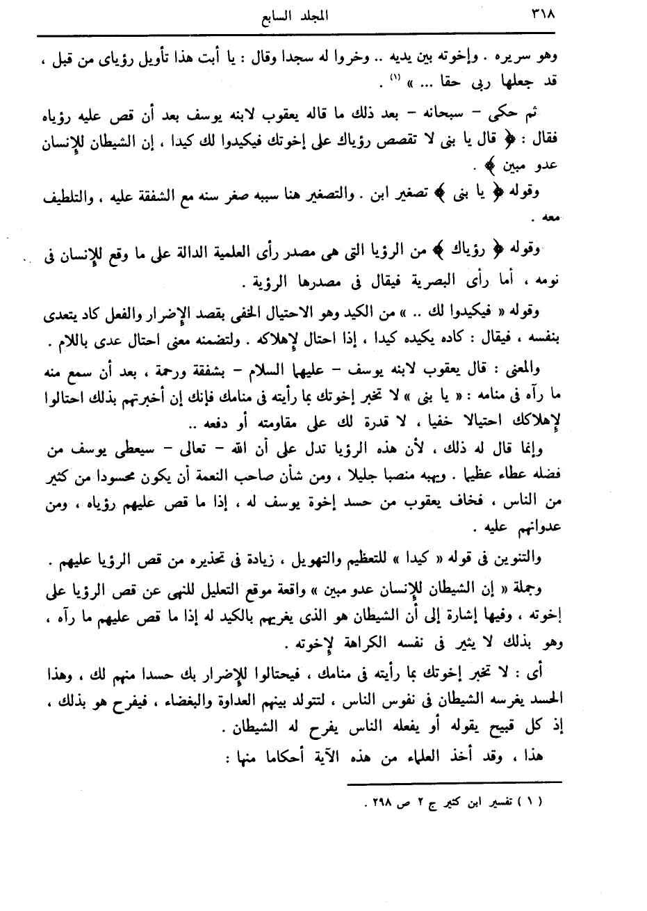 ثم حكى- سبحانه- بعد ذلك ما قاله يعقوب لابنه يوسف بعد أن قص عليه رؤياه فقال: قالَ يا بُنَيَّ لا تَقْصُصْ رُؤْياكَ عَلى إِخْوَتِكَ فَيَكِيدُوا لَكَ كَيْداً، إِنَّ الشَّيْطانَ لِلْإِنْسانِ عَدُوٌّ مُبِينٌ.